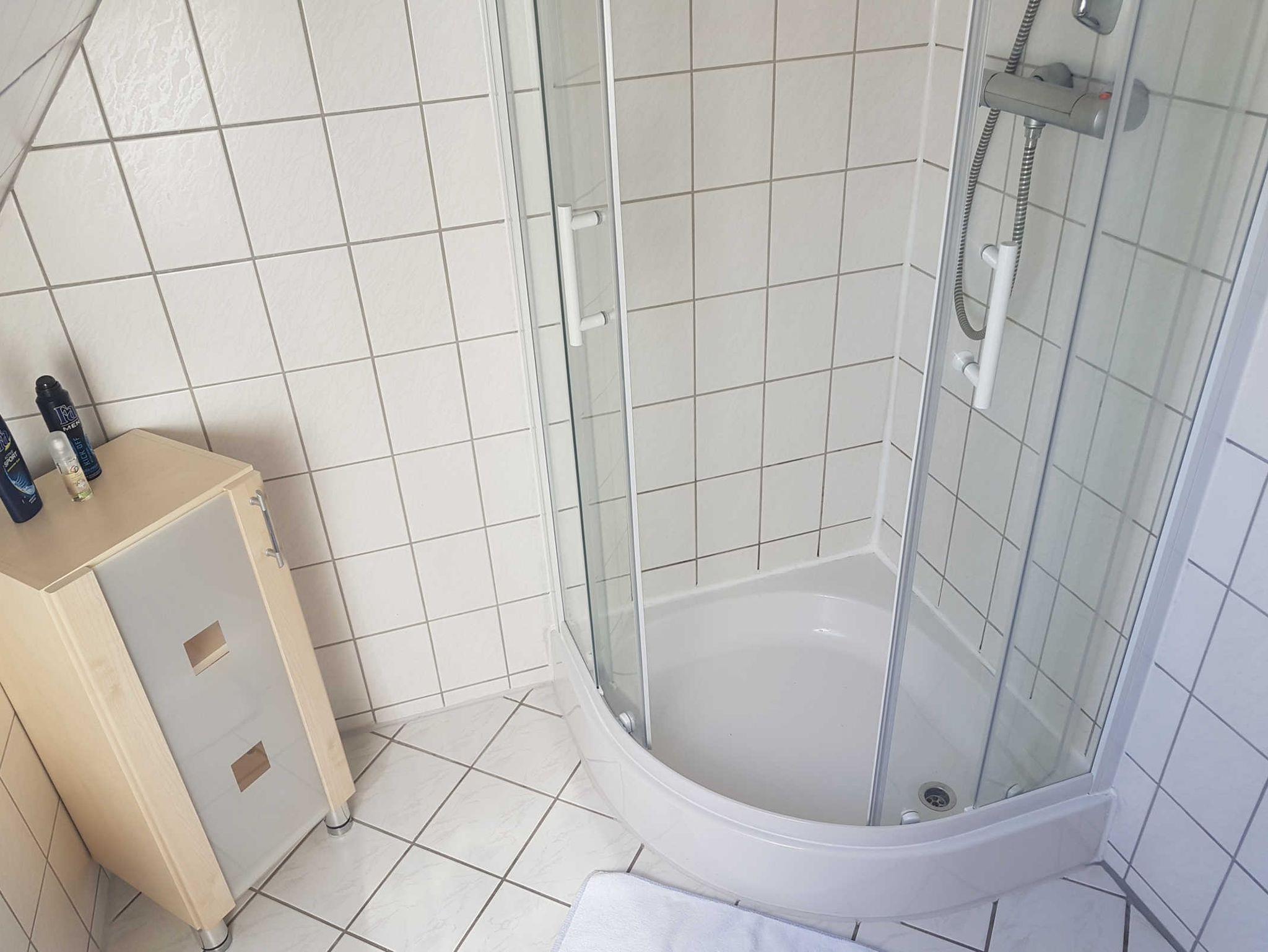 Im gefliesten Bad mit Fenster befinden sich eine Dusche und ein WC.