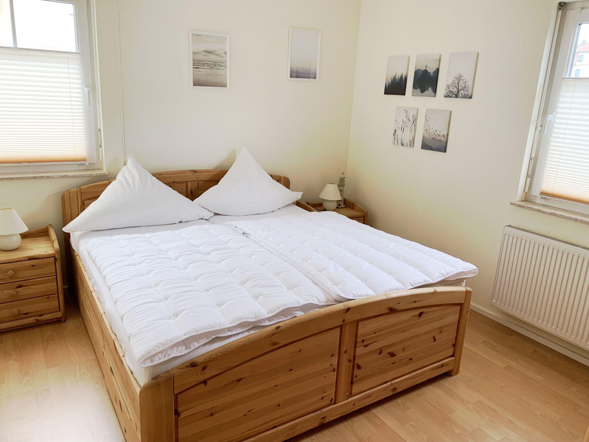 Diese helle, nach Süd-Westen ausgerichtete und freundliche 2-Zimmer-Ferienwohnung im Erdgeschoss eines Mehrfamilienhauses bietet ausreichend Platz für bis zu 3 Personen. Sie ist in einer Sackgasse absolut ruhig gelegen und befindet sich in einer parkähnlichen Gartenanlage mit altem Baumbestand. Im Wohnzimmer befindet sich eine gemütliche Couch, welche sich bei Bedarf zu einer Schlafcouch umwandeln lässt. Vom Wohnzimmer aus haben Sie Zugang zur schönen Terrasse. Ein großer Tisch mit 4 Stühlen verbindet das Wohnzimmer mit der praktischen Küche. Diese ist voll ausgestattet und enthält unter anderem einen Geschirrspüler, einen Kühlschrank mit Gefrierfach, Wasserkocher, Kaffeemaschine, eine Mikrowelle und einen Toaster. Im Schlafzimmer finden Sie ein Doppelbett (2x90x200 cm Matratzen) und einen Kleiderschrank. Die Ferienwohnung verfügt zudem über einen Kinderstuhl und ein Kinderbett für die kleinsten Urlauber. Zur Ferienwohnung gehört außerdem ein direkt an der Wohnung gelegener PKW-Stellplatz mit einem eigenen Fahrradbügel und ein großzügiger Abstellraum.
