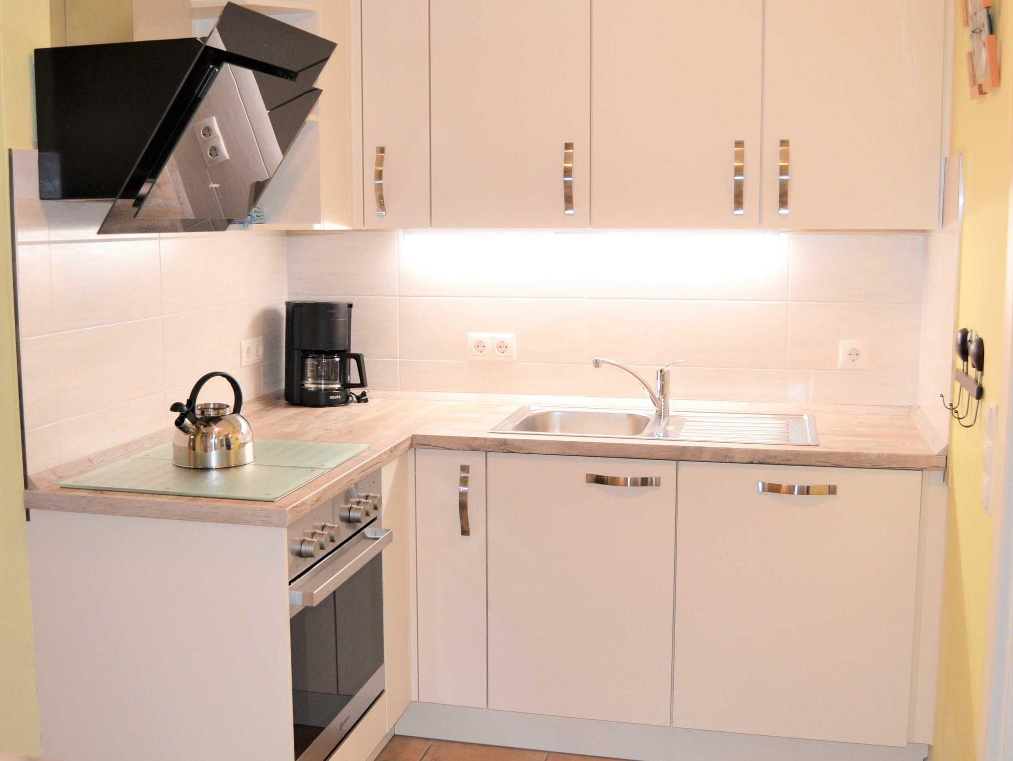 Vom Flur gelangt man weiter in die offene Durchgangs-Einbauküche mit Herd und Backofen, Geschirrspülmaschine, Kühlschrank mit Gefrierteil, Wasserkocher, Kaffeemaschine, Toaster... (und vieles mehr). Ausreichend Geschirr, Besteck und Gläser sind vorhanden.