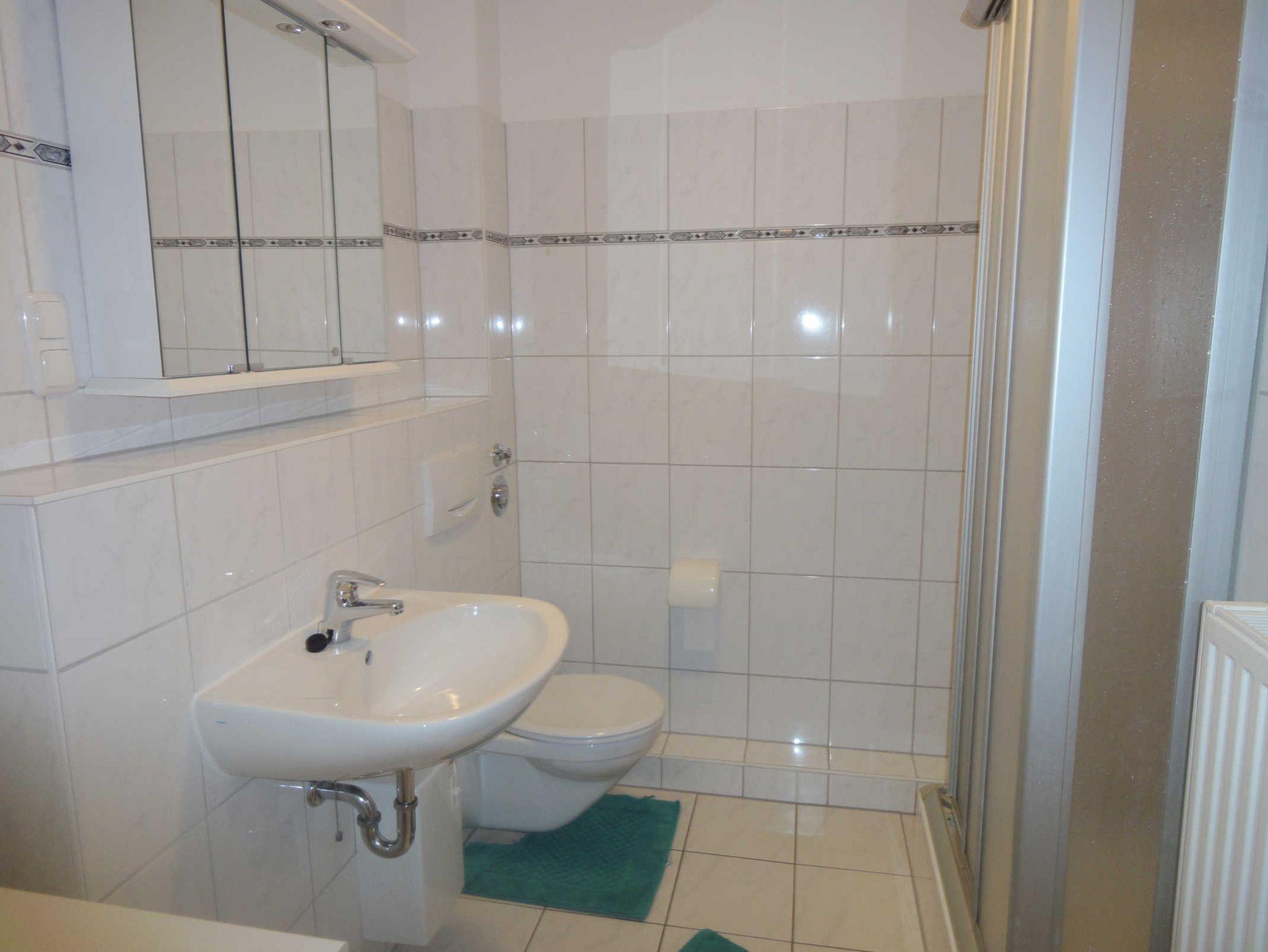 Das geflieste Bad ist mit einer Dusche, einem Waschtisch und einem WC ausgestattet.