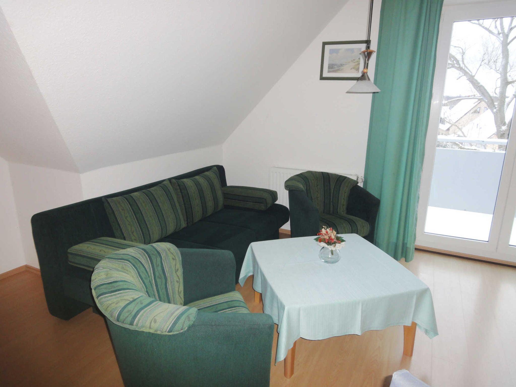 Der Wohn- und Schlafbereich ist mit einer Schlafcouch für 2 Personen ausgestattet und verfügt über eine kleine Stereo Anlage mit CD-Player sowie einen Flachbildfernseher. Zu dem Appartement gehört ein Balkon mit Richtung gen Süden.