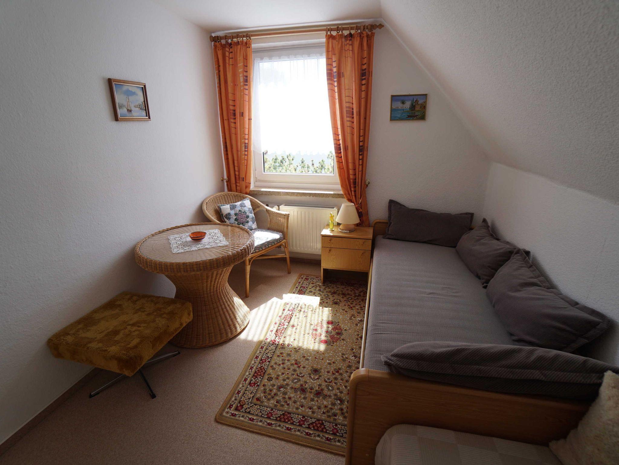 Die Ferienwohnung im Obergeschoß unseres Einfamilienhauses ist ca. 65 m² groß und bietet Platz für 2 bis 3 Personen. Neben dem eigenen Parkplatz (gegen Gebühr 1,50€ proTag, Bezahlung vor Ort bei Schlüsselübergabe) und Fahrradstellplatz können Sie gern die Sitzecke und Liegewiese in unserem Garten benutzen. Im einzelnen verfügt die Wohnung über folgende Räume: