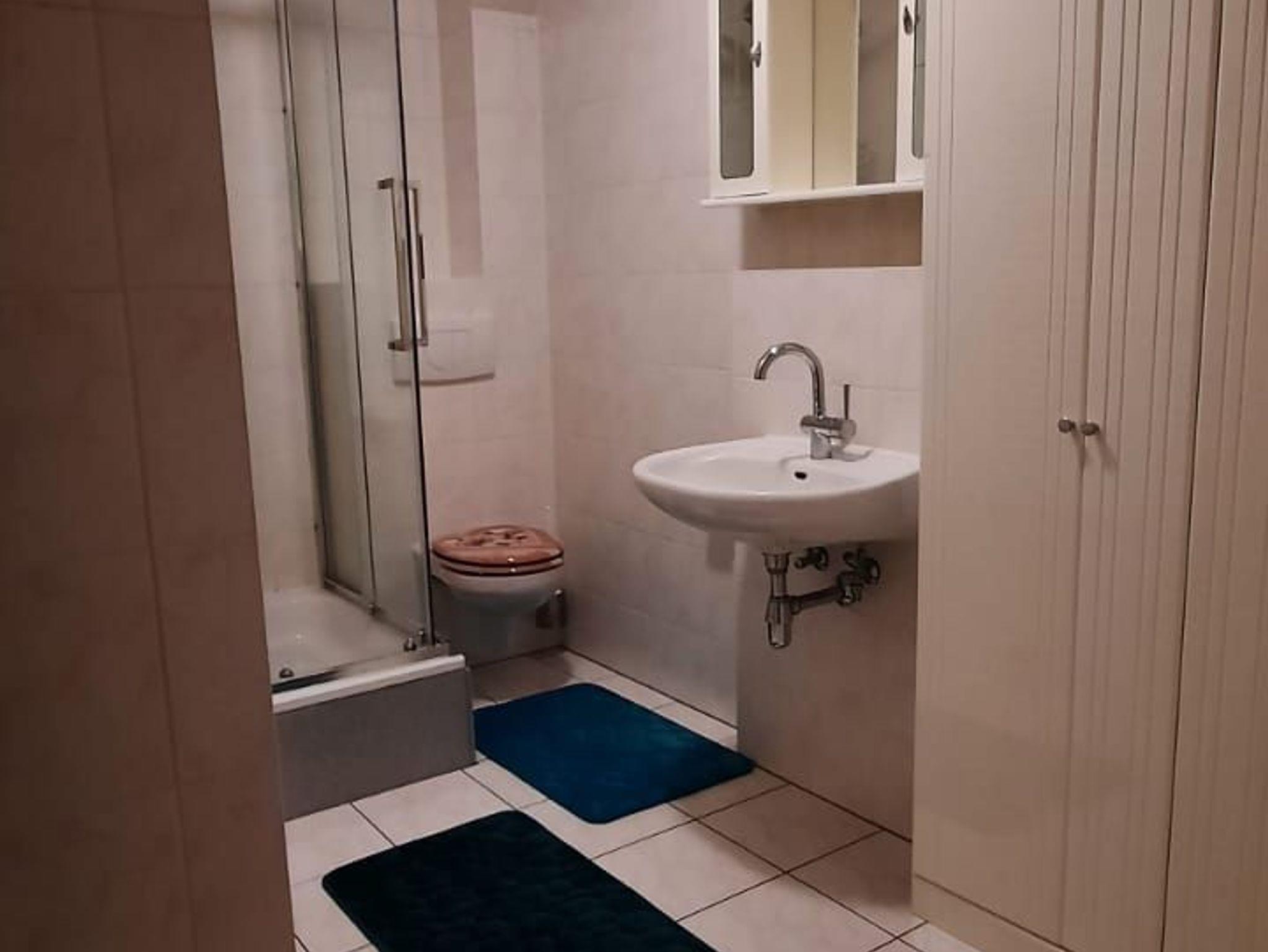 Eckdusche, Waschbecken, Toilette, Spiegelschrank, Schrank, Staubsauger, Wischeimer