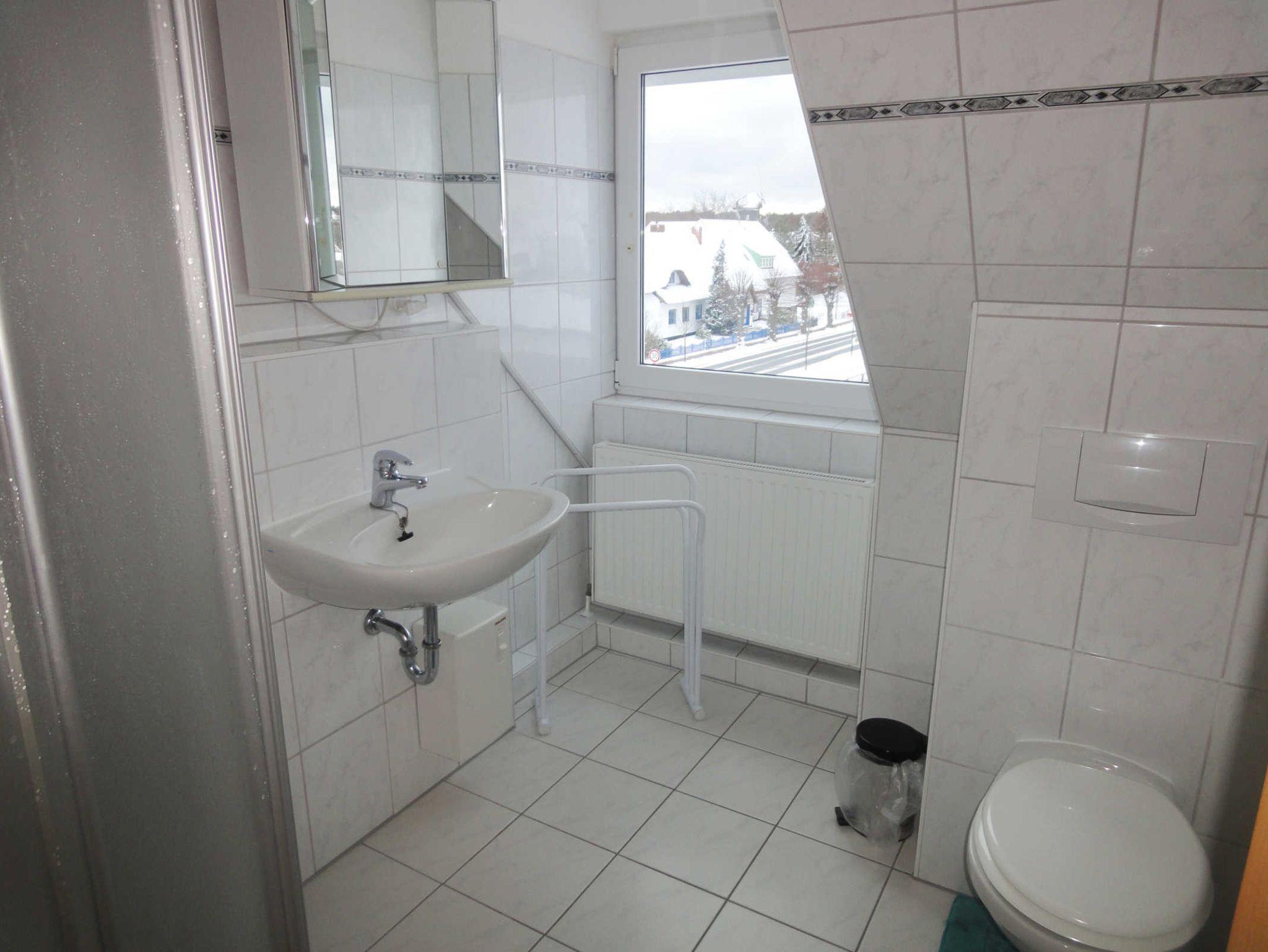 Das geflieste Bad ist mit einer Dusche, einem Waschtisch und einem WC ausgestattet.