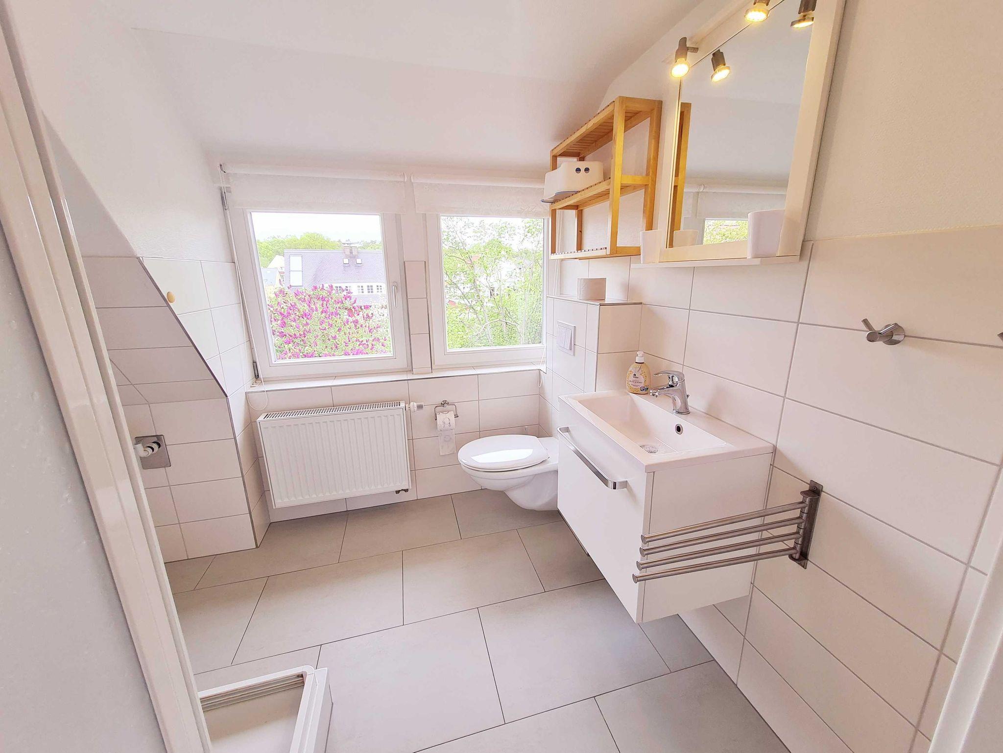 • Badezimmer: mit Fenster, Dusche, WC, Waschbecken mit Unterschrank, Handtuchhalter, Spiegel, Regal