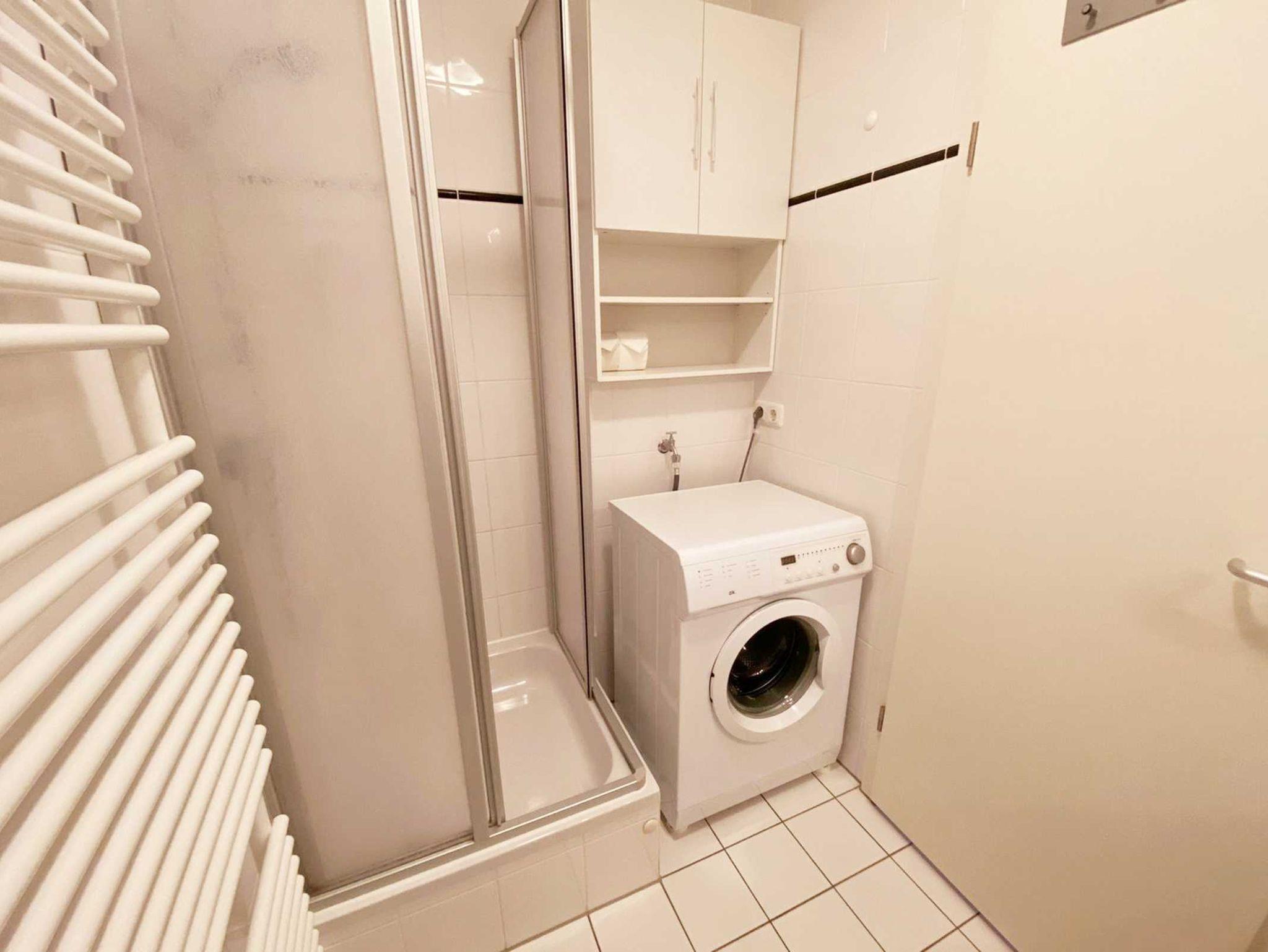 • Bad: ohne Fenster, Dusche, Waschbecken, Toilette, Spiegel, Schrank, Handtuchheizkörper, Waschmaschine