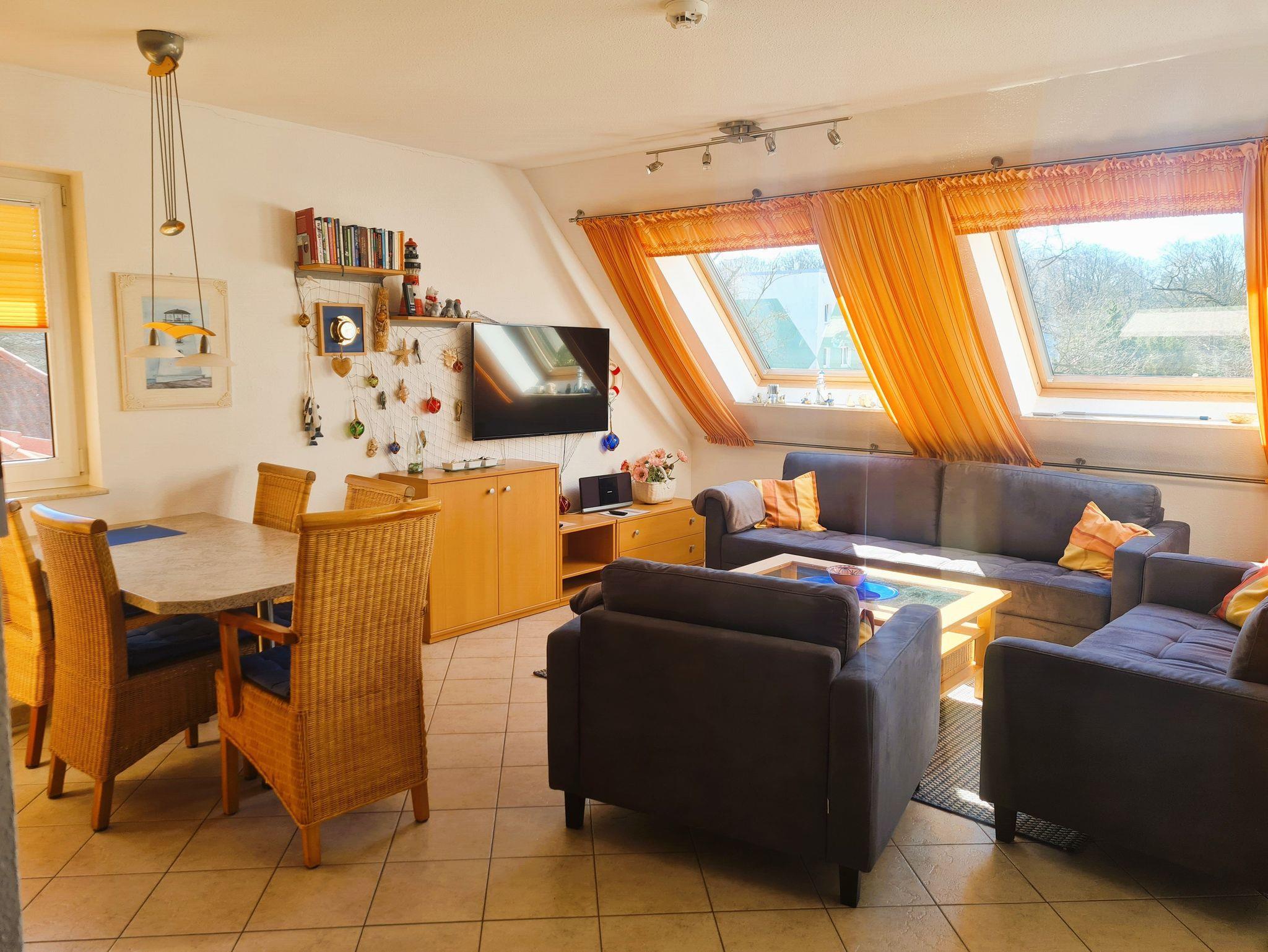 Nur 350m vom Strand entfernt liegt diese gemütlich und modern eingerichtete 3-Raum-Wohnung im Dachgeschoss mit ca. 60 m² Wohnfläche und einer sonnigen großen Dachterrasse in Südausrichtung. Die sehr helle und freundliche Wohnung kann mit bis zu 4 Personen genutzt werden. Zwei separate Schlafzimmer bieten genügend Platz. Praktisch erreichbar befindet sich vor dem Objekt ein abschließbarer Außenabstellraum, der Platz für Fahrräder o.ä. bietet. Der Wohnung ist ein kostenloser Stellplatz Nr. 28 zugeordnet. Ebenso verfügt die Wohnung über eine Waschmaschine und kostenloses W-LAN.