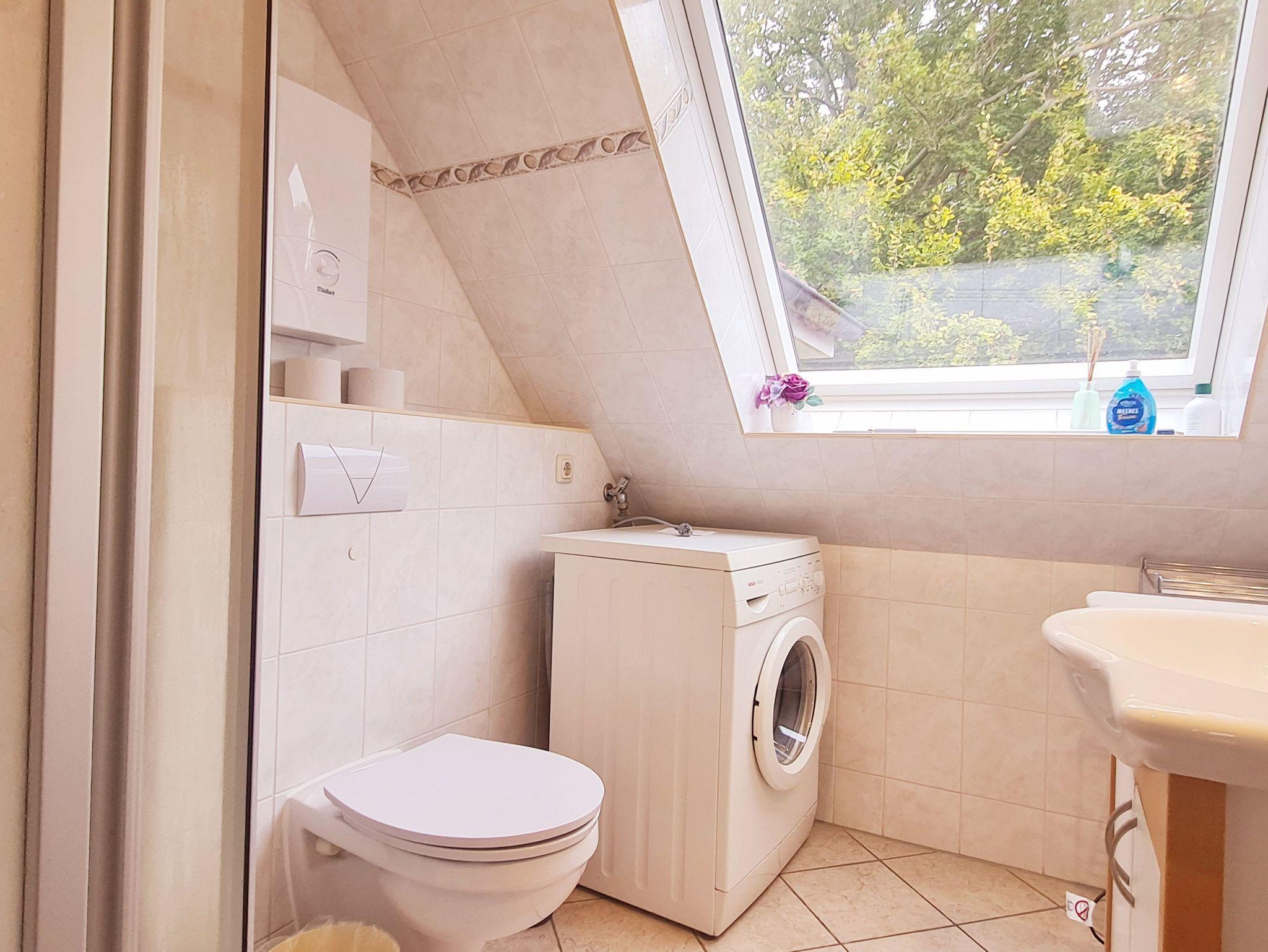 • Bad: mit Fenster, Dusche, Waschbecken mit Unterschrank, Toilette, Spiegel, Waschmaschine, Tageslichtrollo