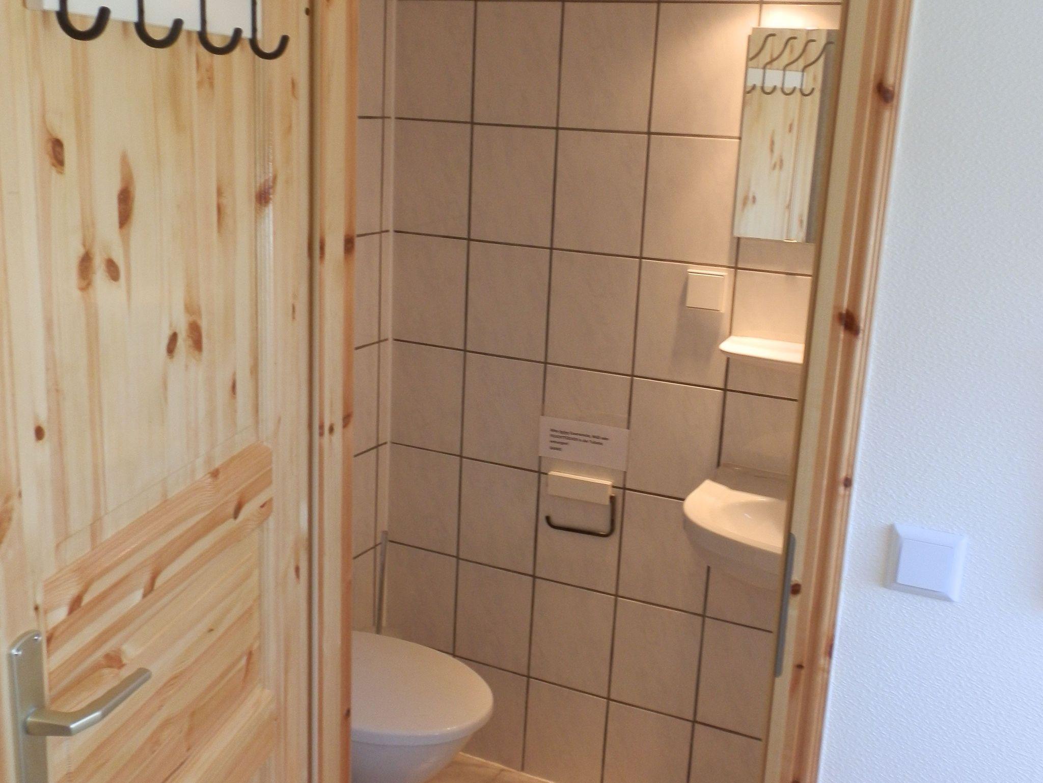 Das kleine Bad ist mit Dusche und WC ausgestattet. Handseife und eine Rolle Toilettenpapier stehen als Erstausstattung zur Verfügung. Föhn und Bügeleisen sind auf Nachfrage erhältlich.