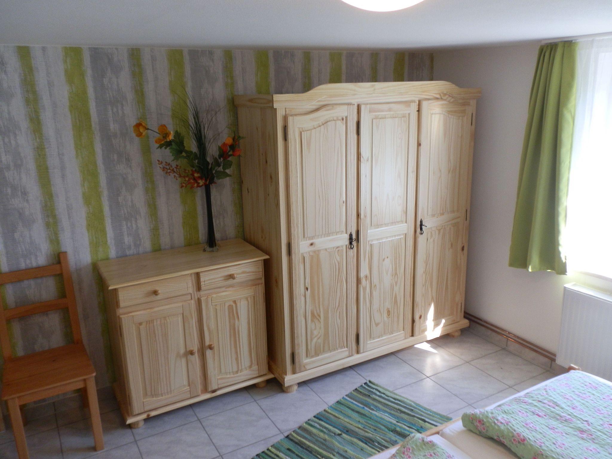 Das Schlafzimmer ist mit einem Doppel- und einem Einzelbett ausgestattet.