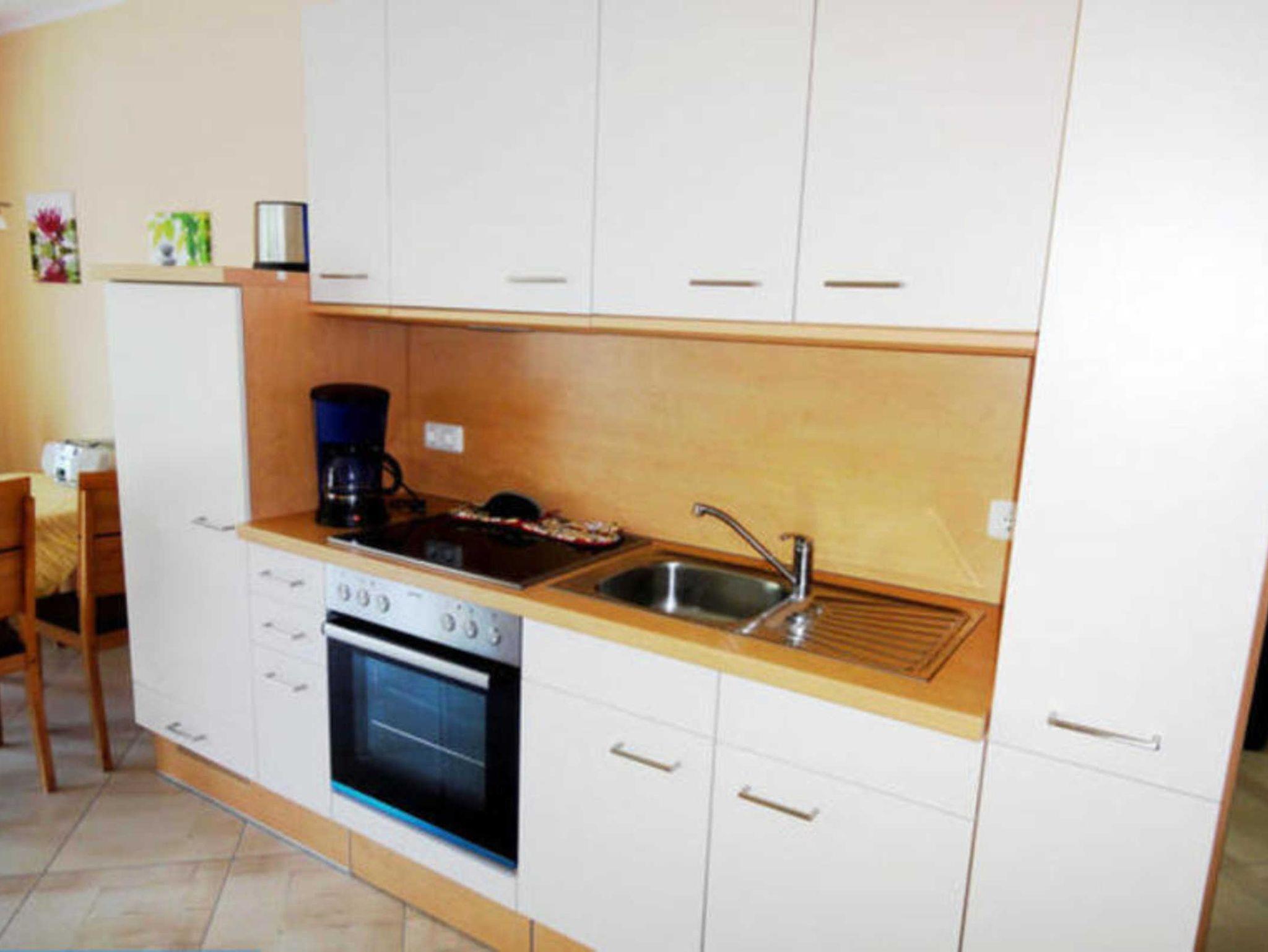 Die in das Wohnzimmer integrierte Küche ist u.a. mit einem Kühlschrank, 4 Kochfelder auf einer Cerankochplatte, einem Wasserkocher und einer Kaffeemaschine sowie einem Esstisch mit 4 Stühlen ausgestattet.