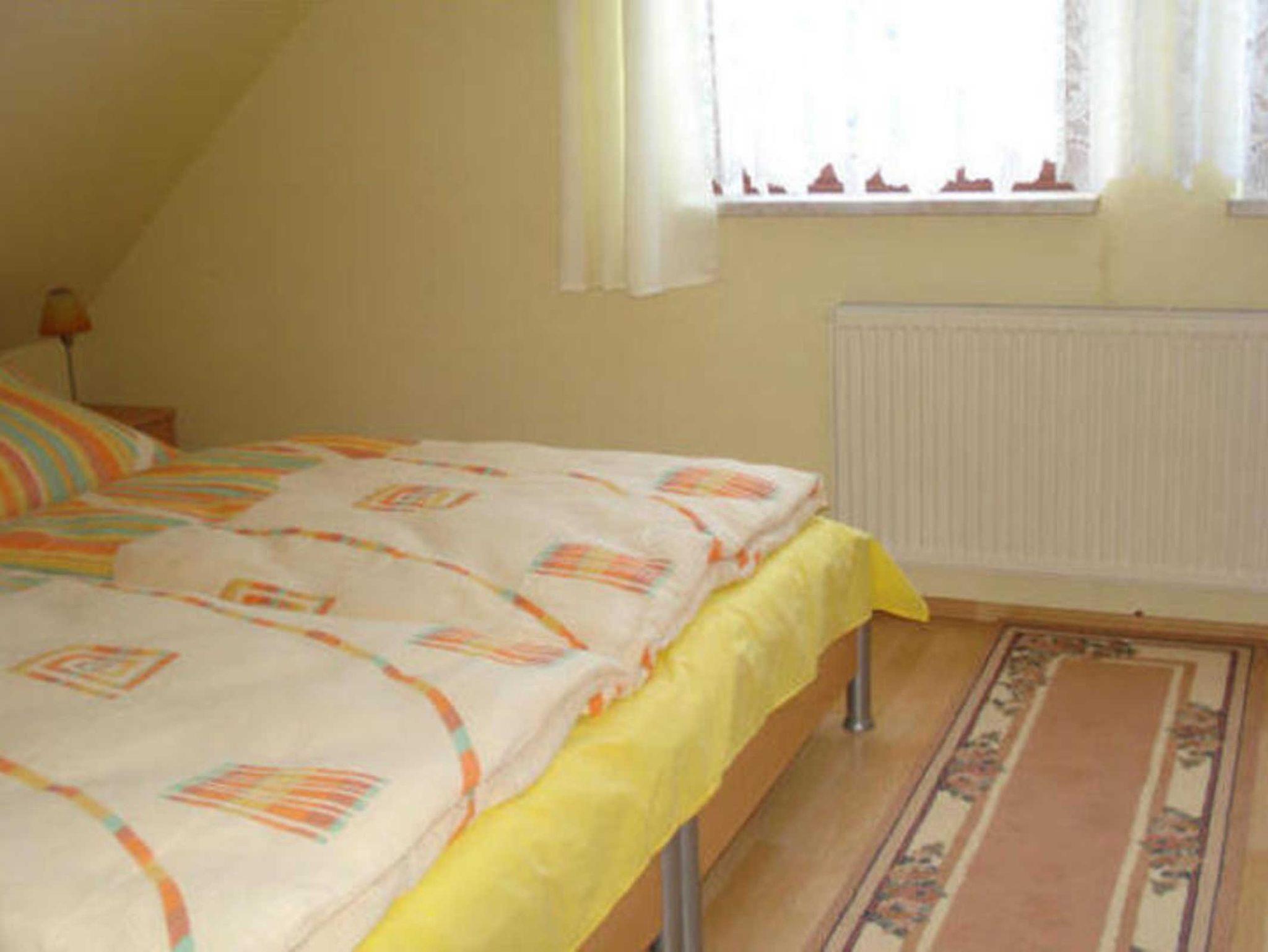 Im Obergeschoss ist ein Bad mit Badewanne. Das Wohnzimmer ist mit Fernseher und Couch ausgestattet, das Schlafzimmer mit einem Doppelbett.