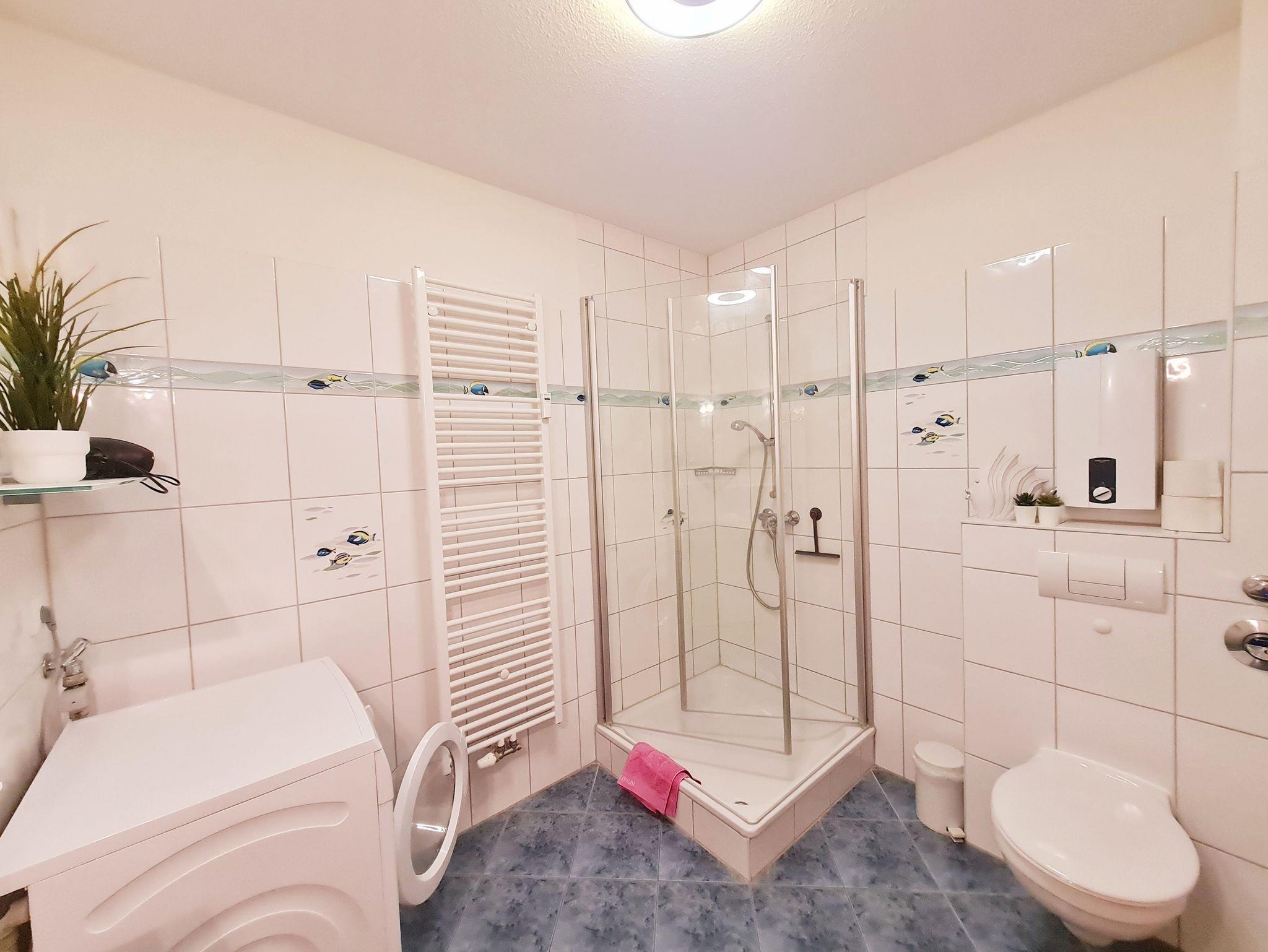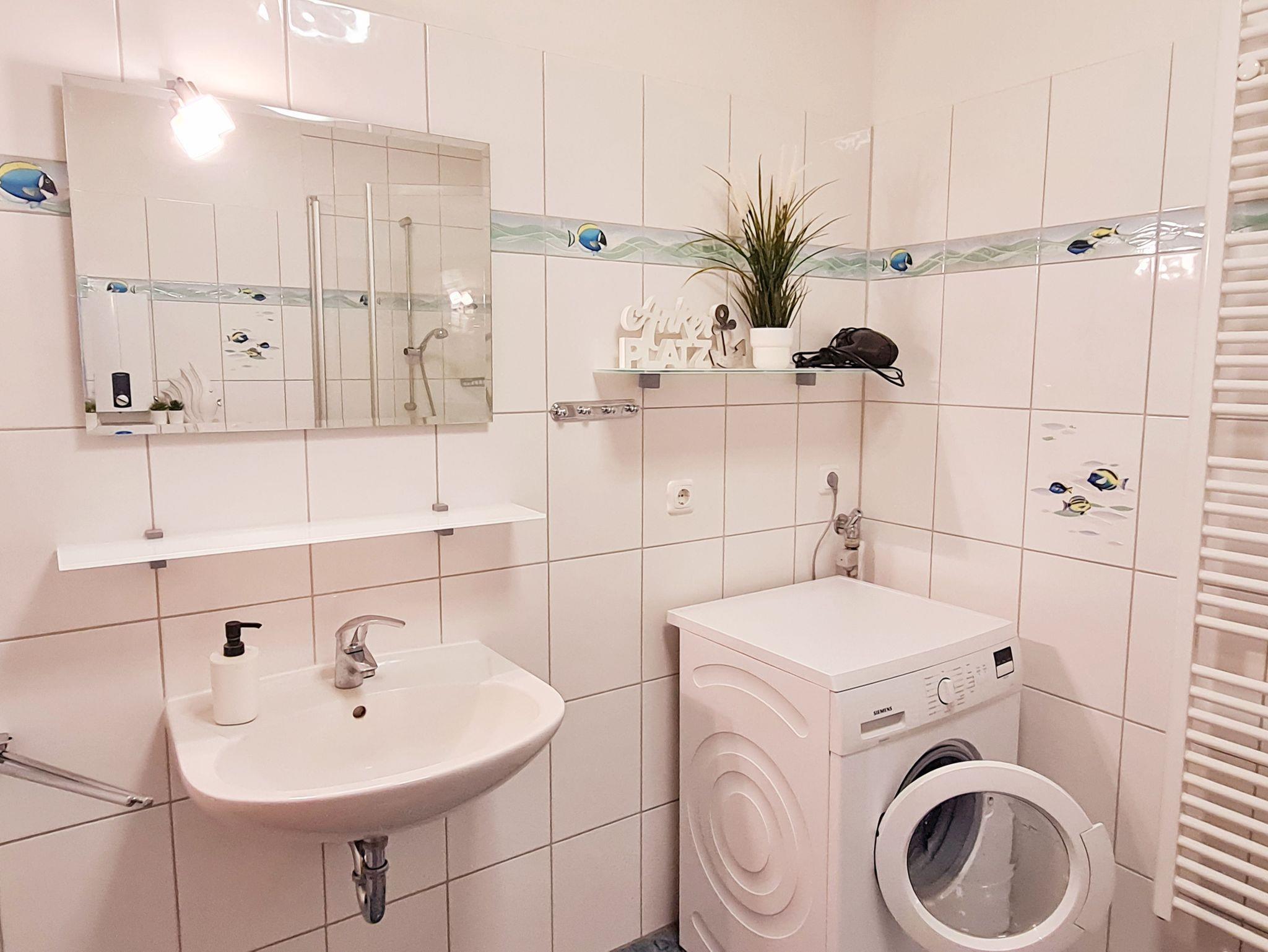 • Bad: ohne Fenster, Dusche, Waschbecken, Toilette, Spiegel, Regal, Handtuchhalter, Tritt, Fön, Waschmaschine