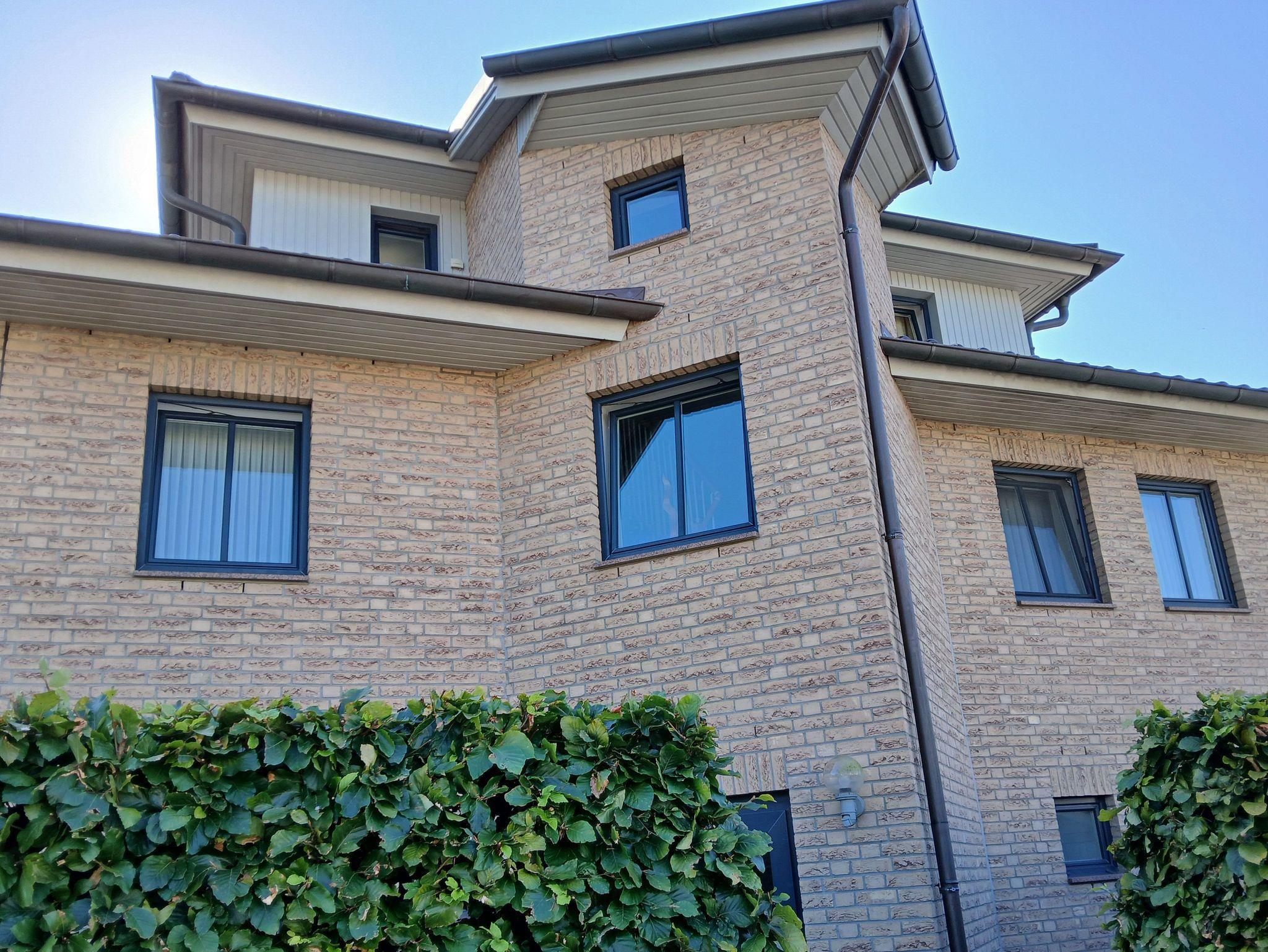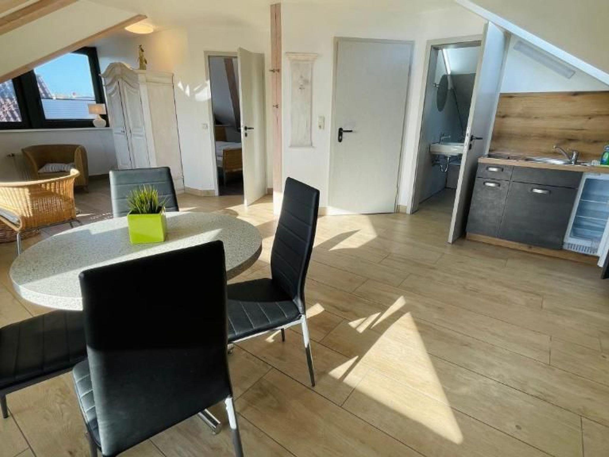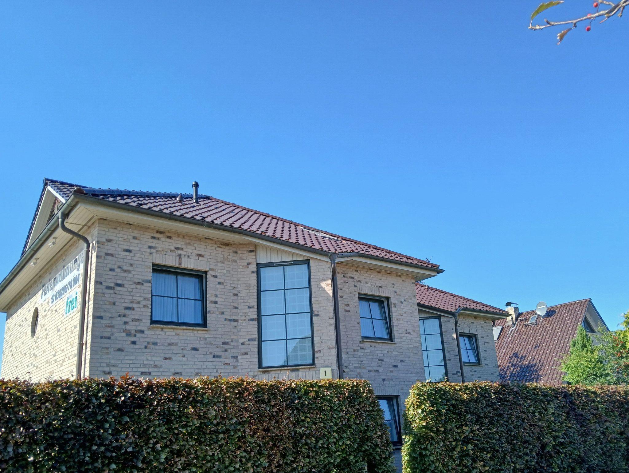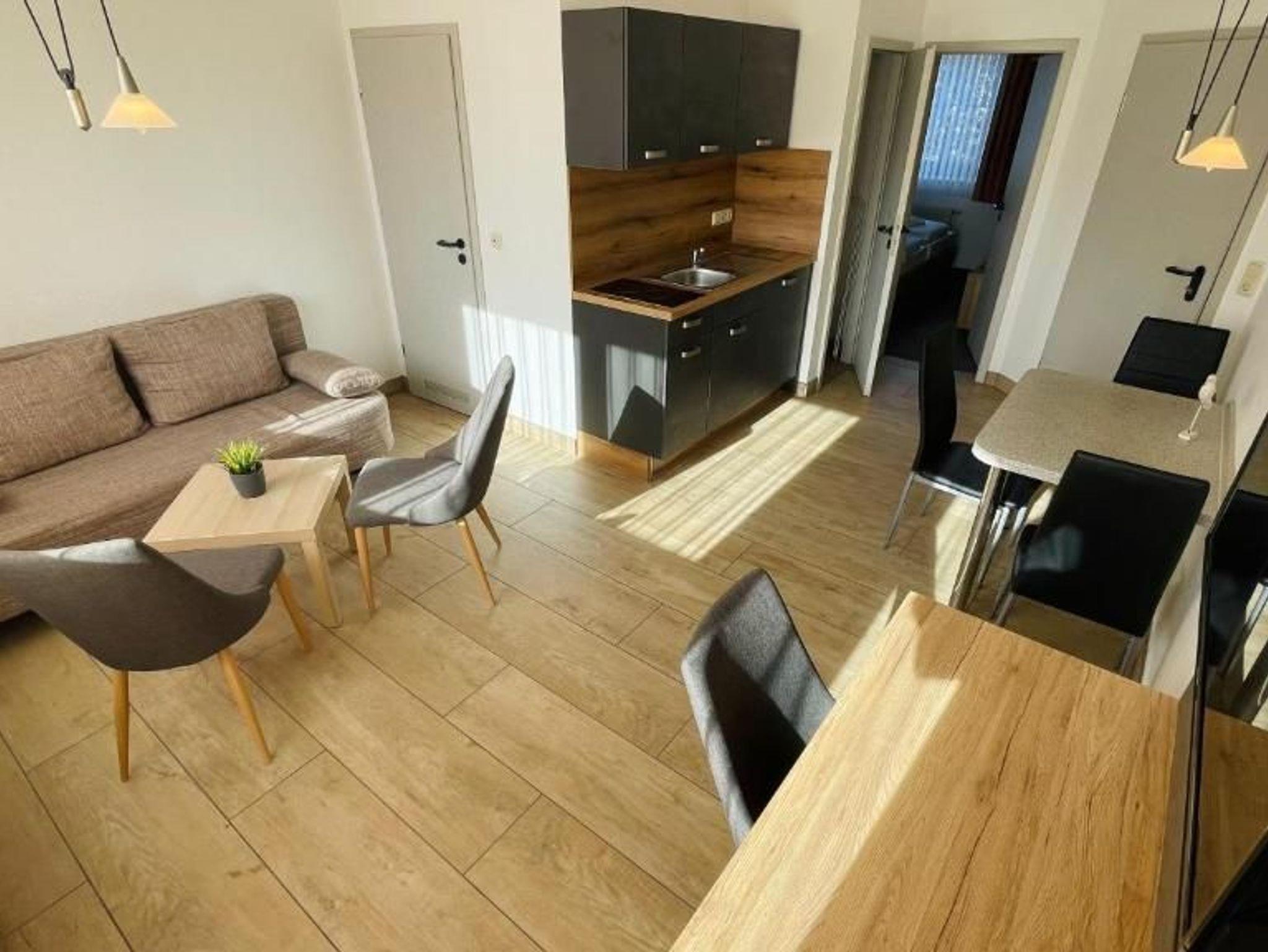 Die Ferienwohnung befindet sich in einem Reihenhaus im Parterre. Die Küchenzeile ist offen zum Wohnbereich.