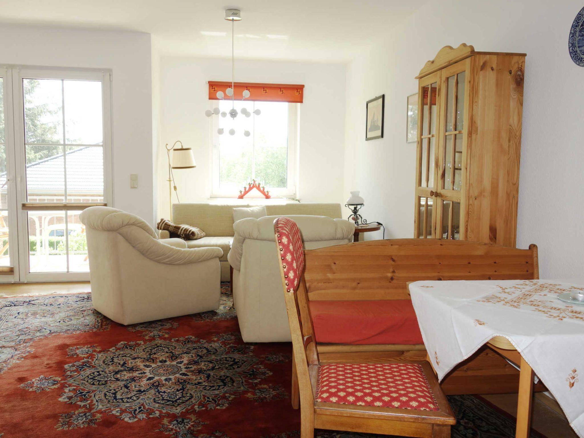 Das helle Wohnzimmer verfügt über eine Couch, 2 Sessel sowie über einen Fernseher und ein Radio. In dem Wohnzimmer steht auch ein Tisch mit 2 Sitzbänken und einem Stuhl.