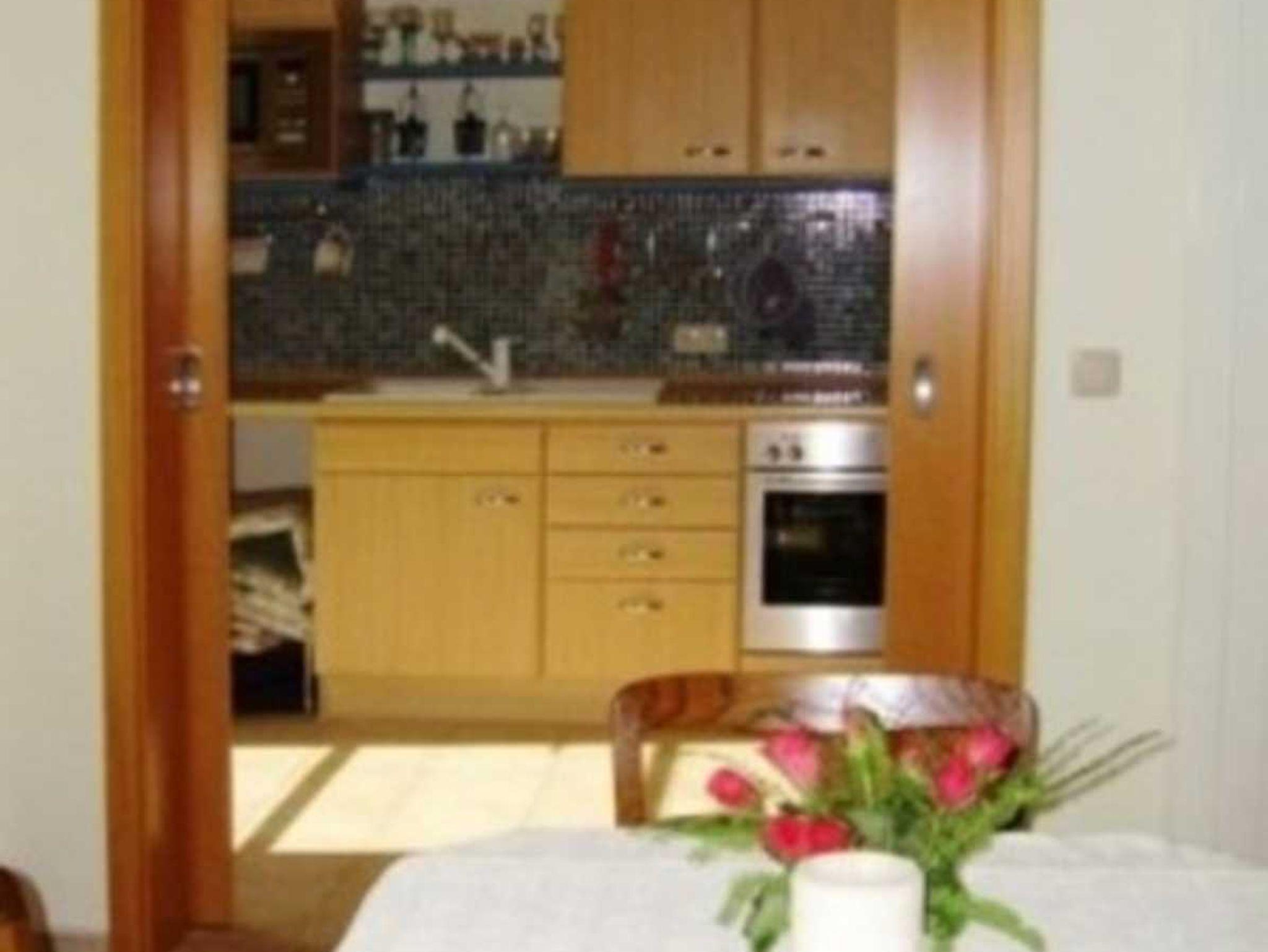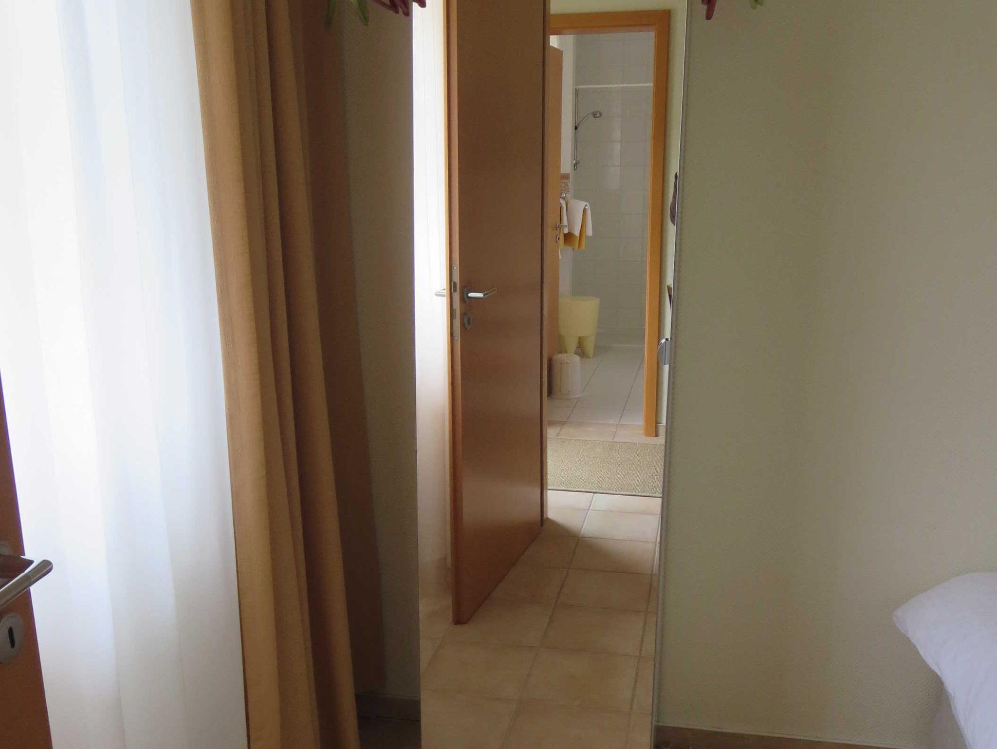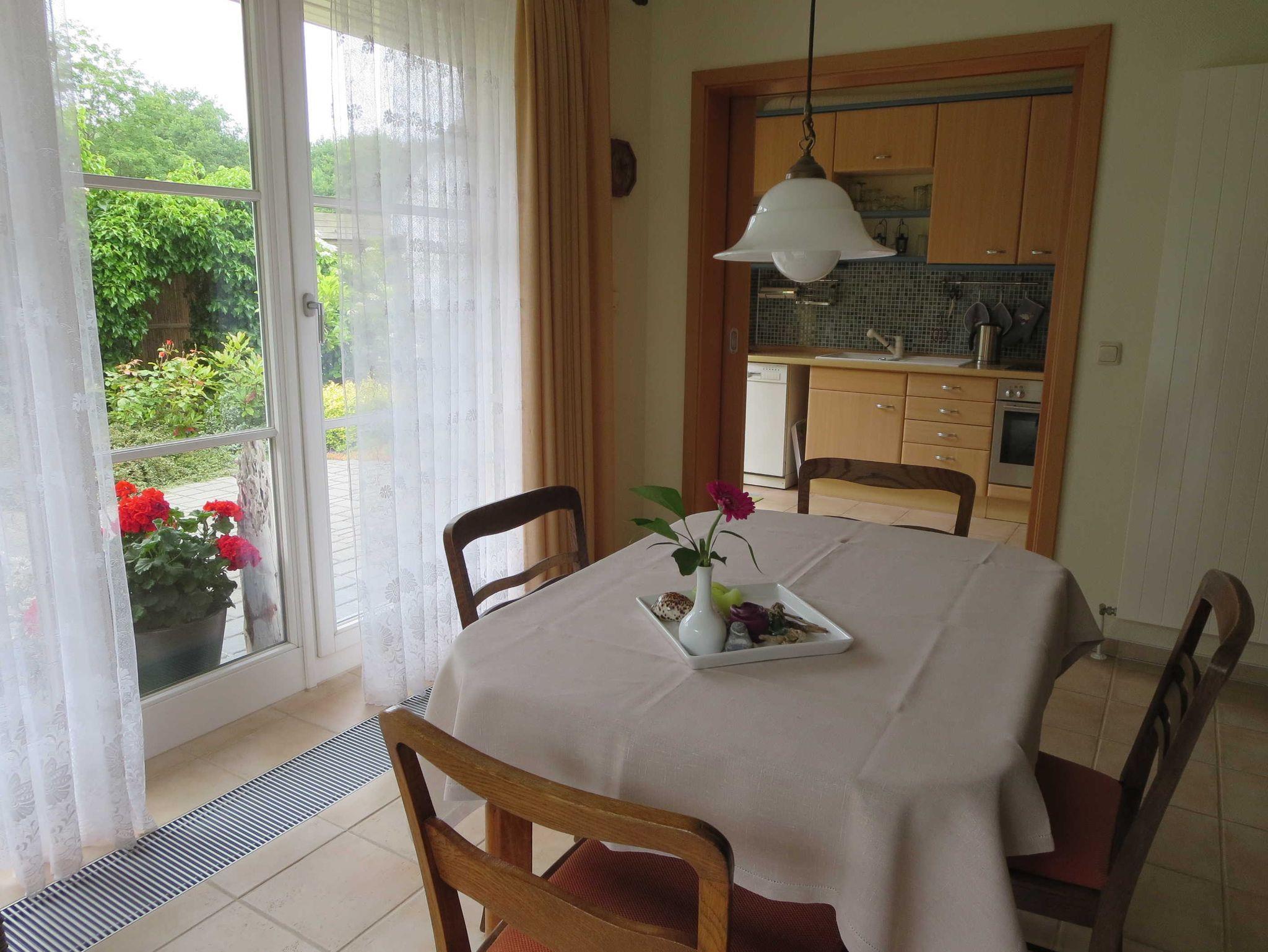 DVD-Player, Radio), hat eine schönen Blick auf den gepflegten Garten und direkten Terrassenzugang. Das kleine Schlafzimmer hat ein 160 cm breites Doppelbett, das auf Wunsch auch getrennt aufgestellt werden kann, und Garderobenstauraum. Die voll ausgestattete, separate Küche mit Kühlschrank, Tiefkühlschrank, Ceranherd, Backofen, Microwelle, Geschirrspüler, Kapselmaschine Krups Dolce Gusto, Kaffeemaschine und Toaster hat ebenfalls direkten