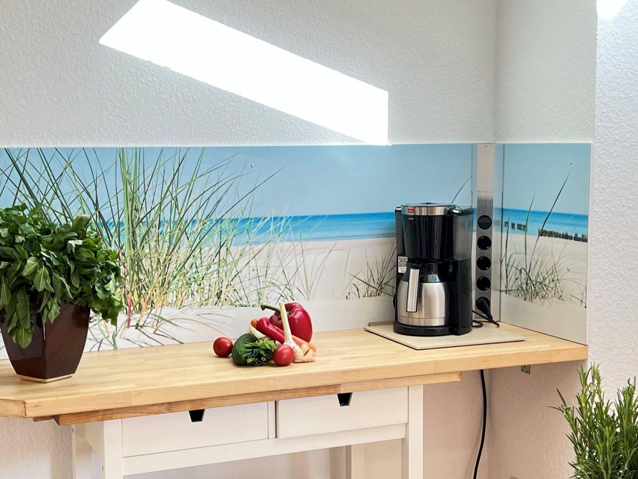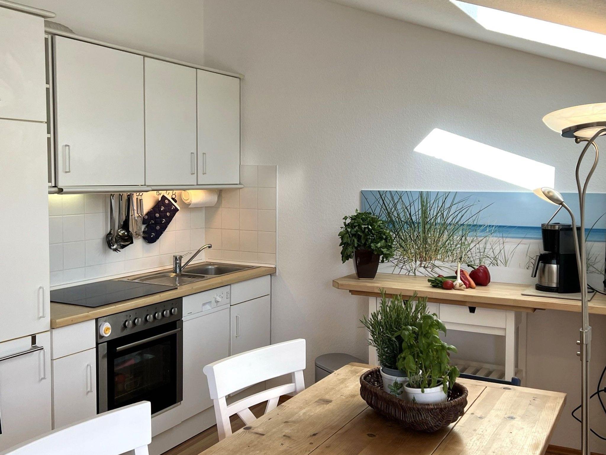 Die offene Küche verfügt über eine sehr gute Ausstattung für alle Selbstversorger (Geschirrspülmaschine, Cerankochfeld mit Backofen, Kühlschrank mit Gefrierfach, Mikrowelle, Kaffeemaschine, Wasserkocher, Toaster, Handmixer sowie ausreichend Geschirr und Besteck.