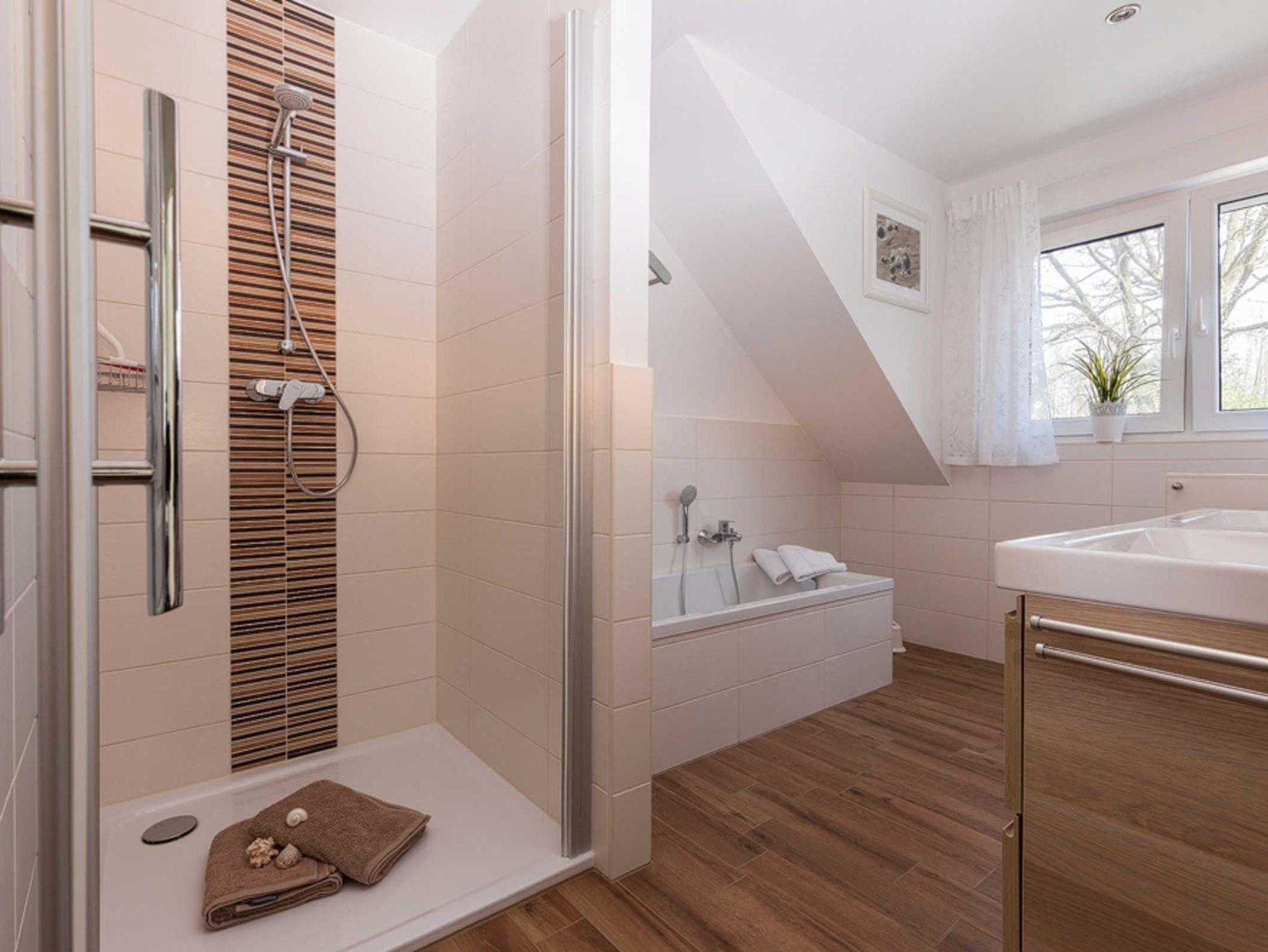 • Bad (oben): 100cm x 100 cm Dusche mit Glastür, Badewanne, Doppelwaschtisch, WC und Handtuchtrockner, Fön, Kosmetikspiegel, ausreichend Abstellfläche, gemütliche Gaube