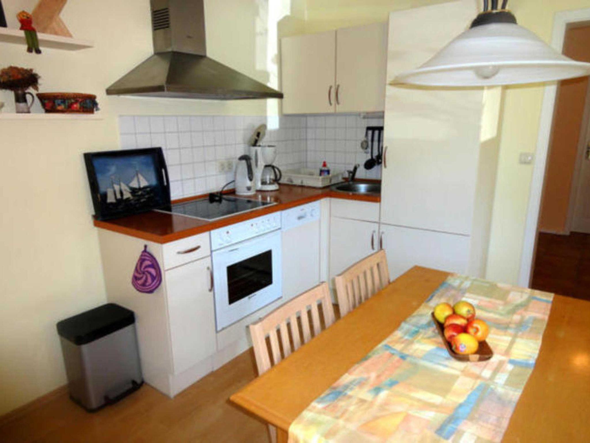 Die Küche mit einer Essecke ist in das Wohnzimmer integriert und ist unter anderem mit 4 Kochfeldern auf einem Cerankochfeld, einer Backröhre, einer Geschirrspülmaschine, einem Kühlschrank, einem Wasserkocher und einer Kaffeemaschine ausgestattet.