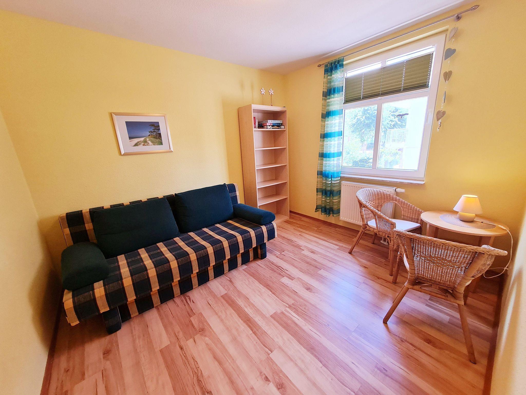 • Schlafzimmer II: Schlafcouch 160x200 cm, zwei Korbsessel, Tisch, Regal, Lampe, Plissee zur Verdunklung (nicht ganz dunkel), Spiele