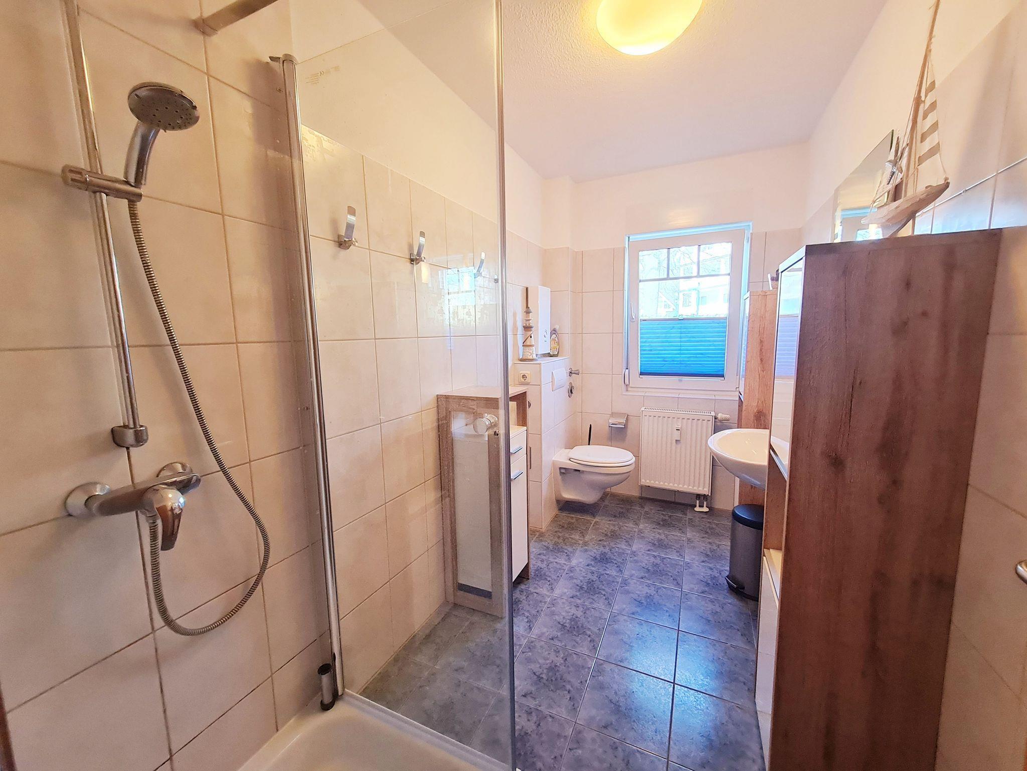 • Bad: mit Fenster, Dusche, Waschbecken, Toilette, Spiegel, Schränke, Handtuchhaken