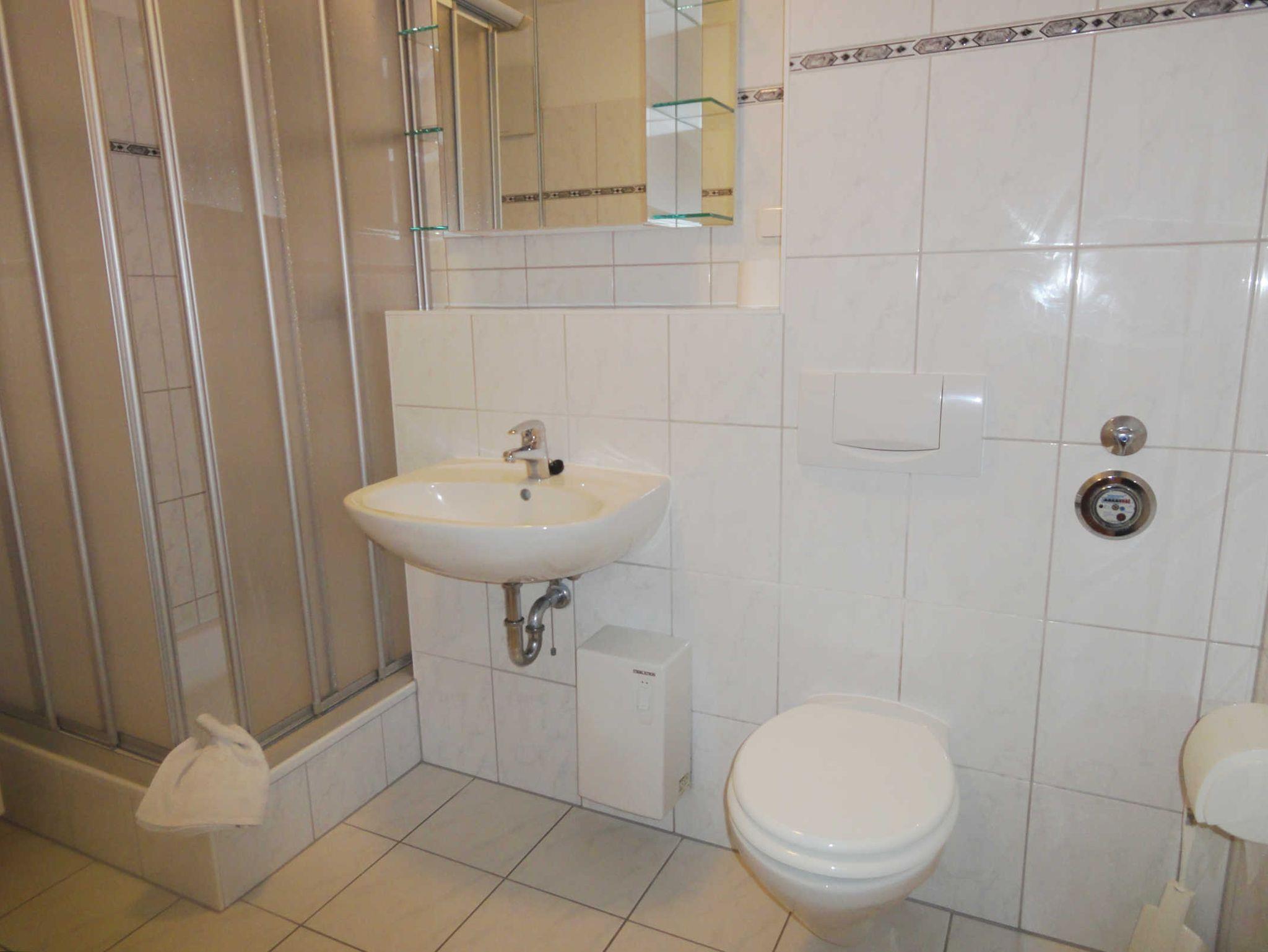 Das geflieste Bad ist mit einer Dusche, einem Waschtisch und einem WC ausgestattet.
