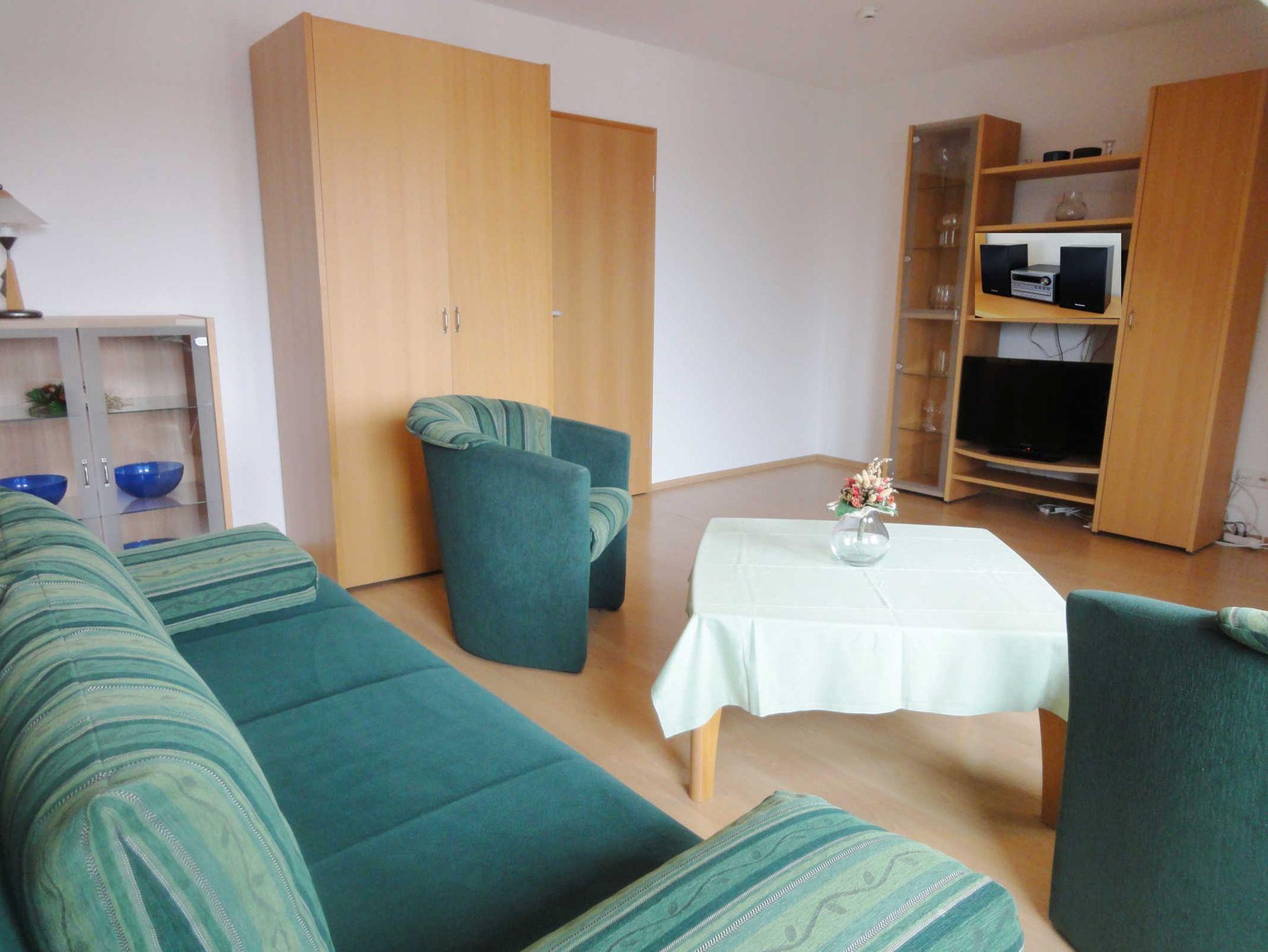 Der geräumige Wohn- und Schlafbereich ist mit einer Schlafcouch für 2 Personen ausgestattet und verfügt über eine kleine Mini-CD-Stereoanlage und einen Flachbildfernseher sowie einen Balkon Richtung Süden.