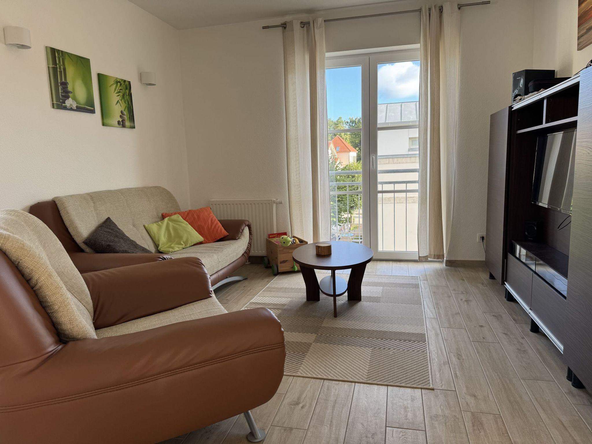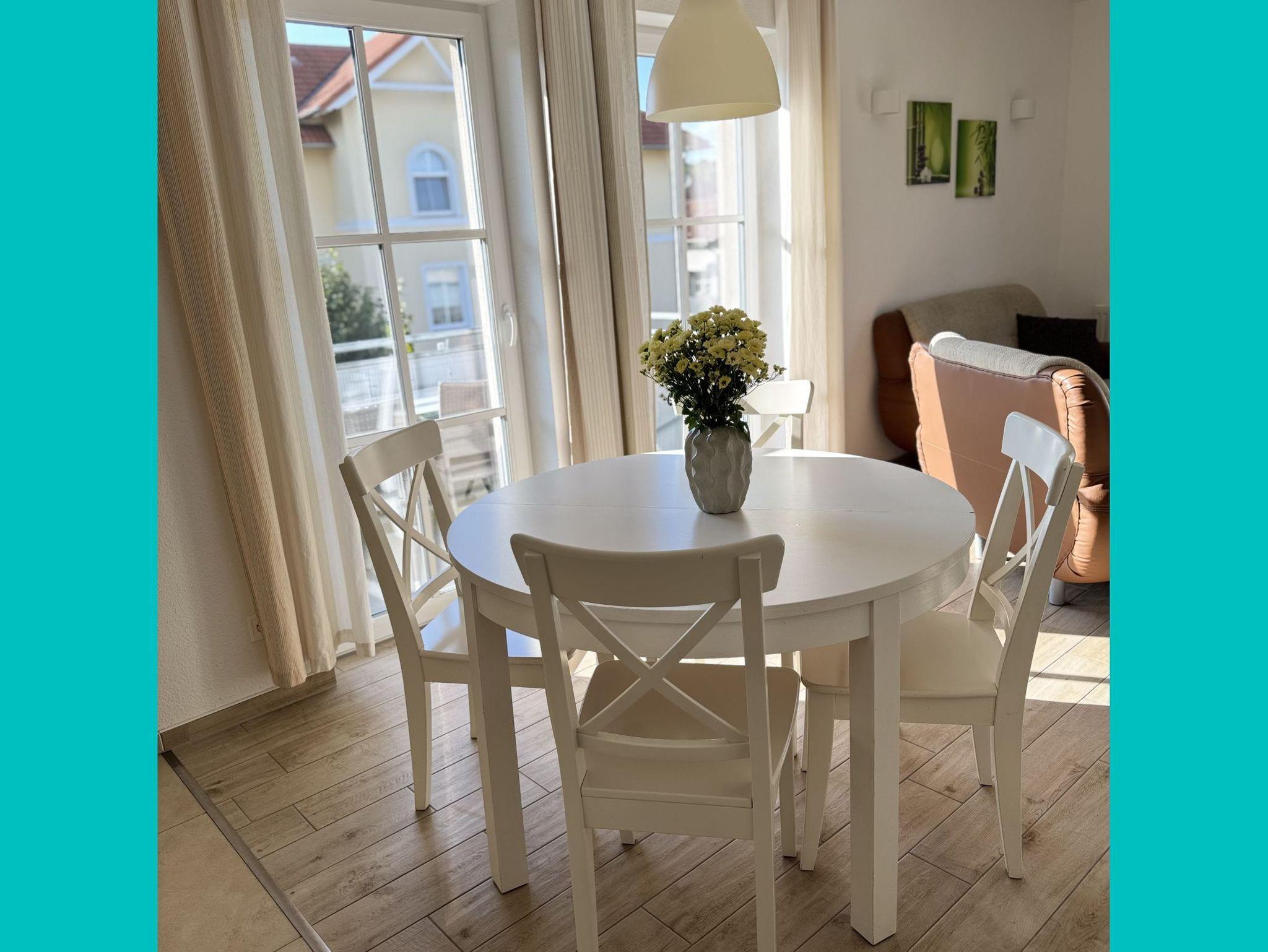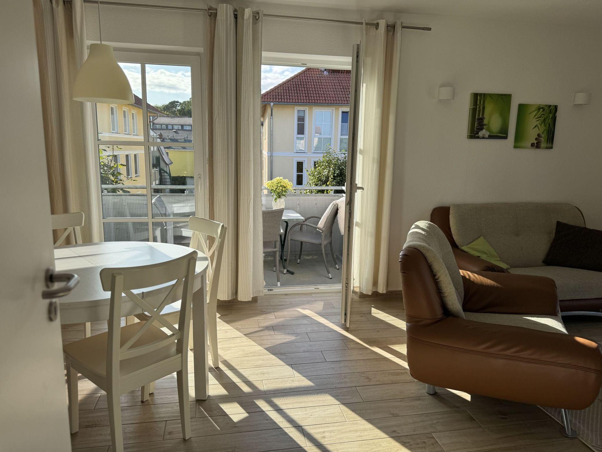 Der freundliche Wohnbereich bietet eine gemütliche Sitzecke mit Sofa und Sessel, einen LCD-Fernseher sowie direkten Zugang zum sonnigen Südwest-Balkon ausgestattet mit Tisch und 4 Stühlen. Ideal für entspannte Stunden an der frischen Ostseeluft.