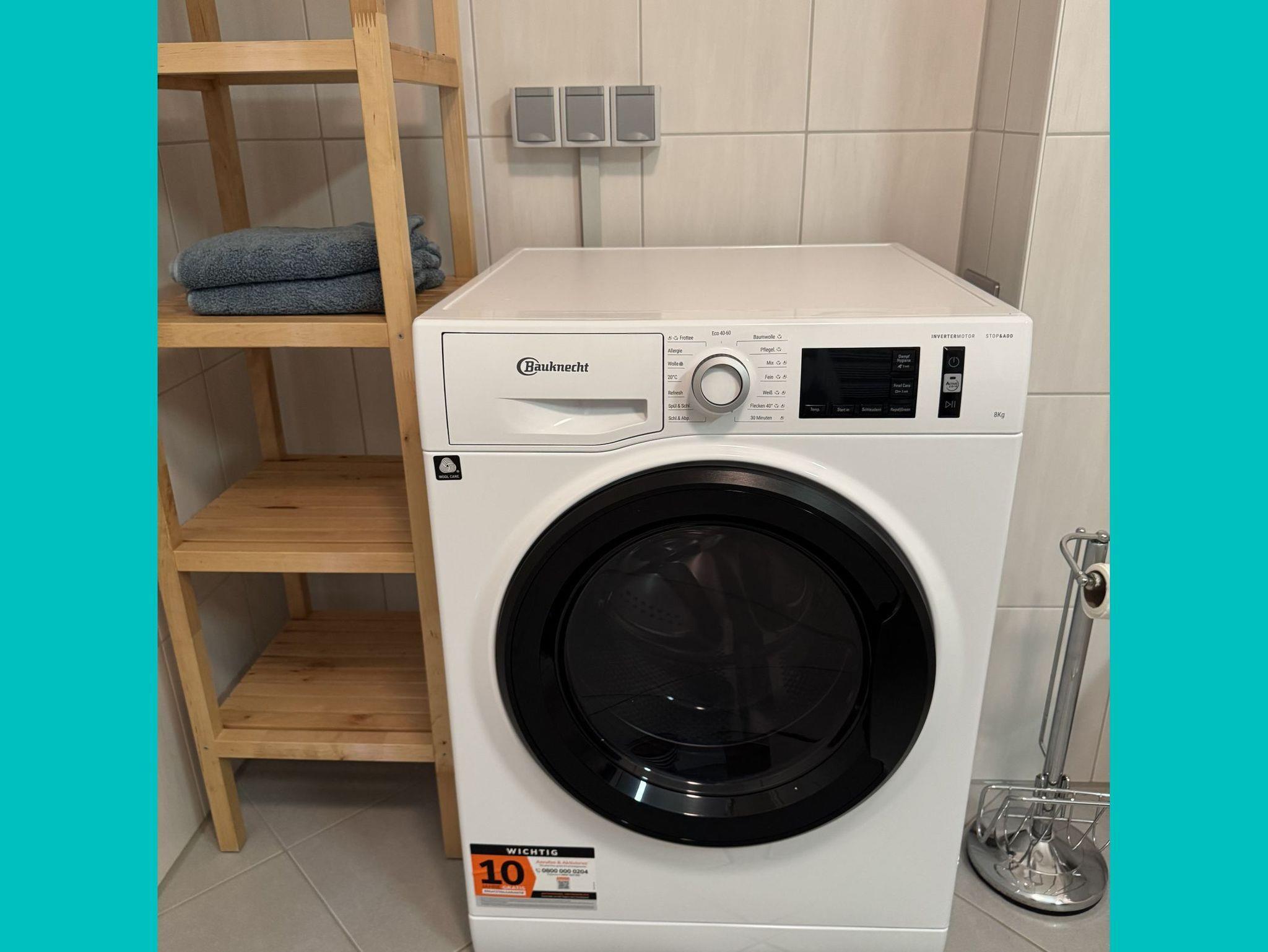Das Bad hat eine große ebenerdige Echtglas-Dusche, ein WC, eine Waschmaschine sowie einen Fön.