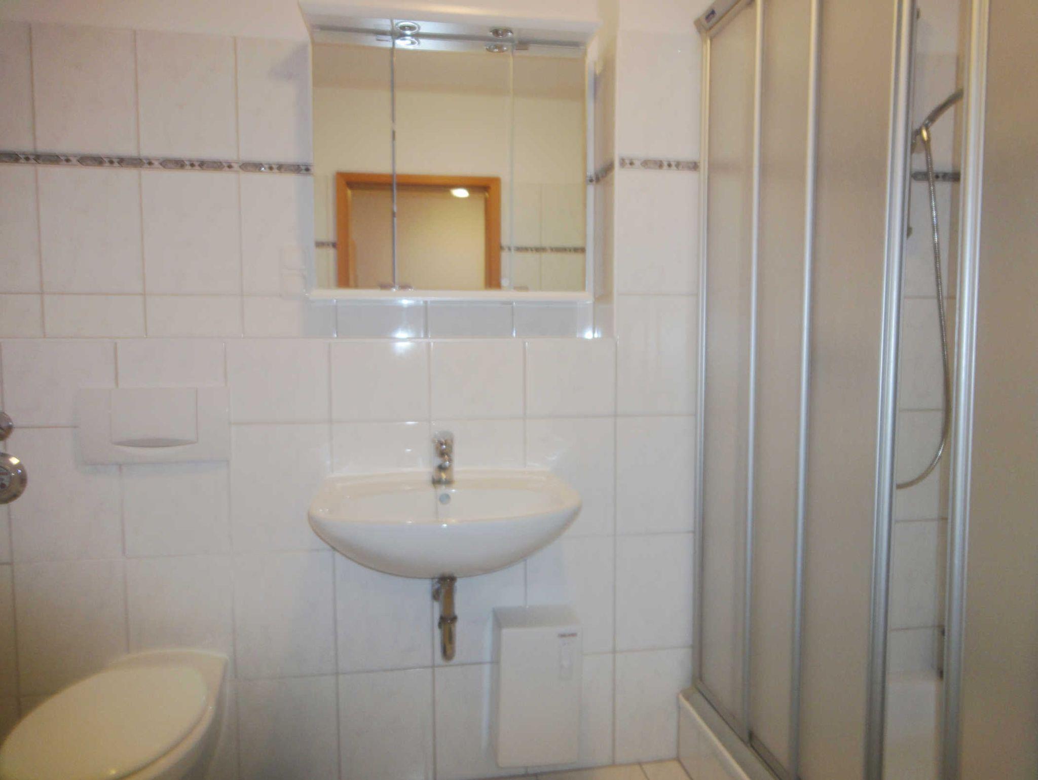 Das geflieste Bad ist mit einer Dusche, einem Waschtisch und einem WC ausgestattet.
