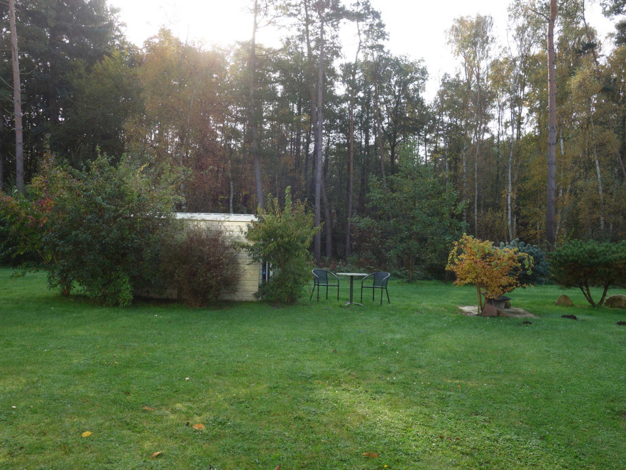 Das kleine Zimmer verfügt über ein Doppelbett, einen Kleiderschrank, einen Flachbildfernseher, einen Tisch mit 2 Stühlen sowie über einen kleinen Kühlschrank, einen Wasserkocher und etwas Geschirr. Ein kleines Bad mit einer Dusche, einem WC und einem Waschbecken gehören zu dem Zimmer. Die Benutzung des Fahrradschuppen wird sich mit einem anderem Zimmer geteilt. Die Wiese um den Fahrradschuppen kann mitbenutzt werden. 2 Stühle und ein Tisch befinden sich im Fahrradschuppen. An allen Fenstern befinden sich Insektenschutzgitter.