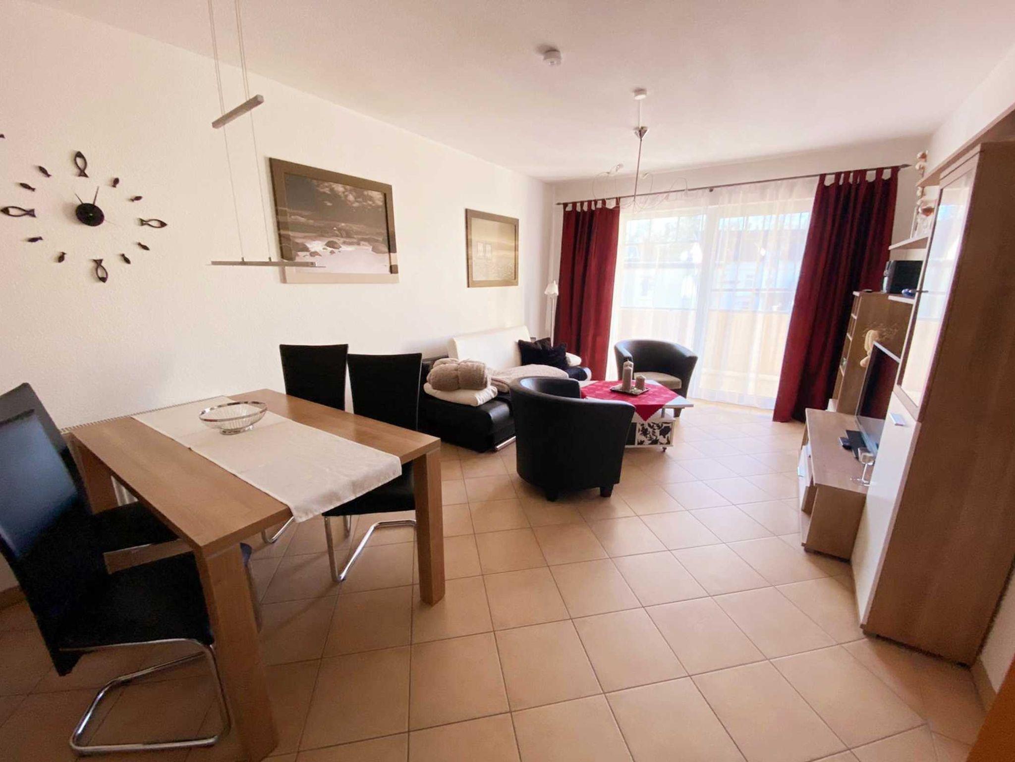 Nur 350m vom Strand entfernt liegt diese gemütlich und modern eingerichtete 2-Raum-Wohnung im 2. OG mit ca. 48 m² Wohnfläche und einem sonnigen Südbalkon. Die sehr familienfreundliche Wohnung kann mit bis zu 4 Personen genutzt werden. Ein separates Schlafzimmer und eine 1,40x2,00 m große Schlafcouch, bieten Platz für 4 Personen. Praktisch erreichbar befindet sich vor dem Objekt ein abschließbarer Außenabstellraum, der bis zu 4 Fahrrädern Platz o.ä. bietet. Der Wohnung ist ein kostenloser Stellplatz Nr. 11 zugeordnet. Ebenso können Sie das kostenlose W-Lan nutzen.
