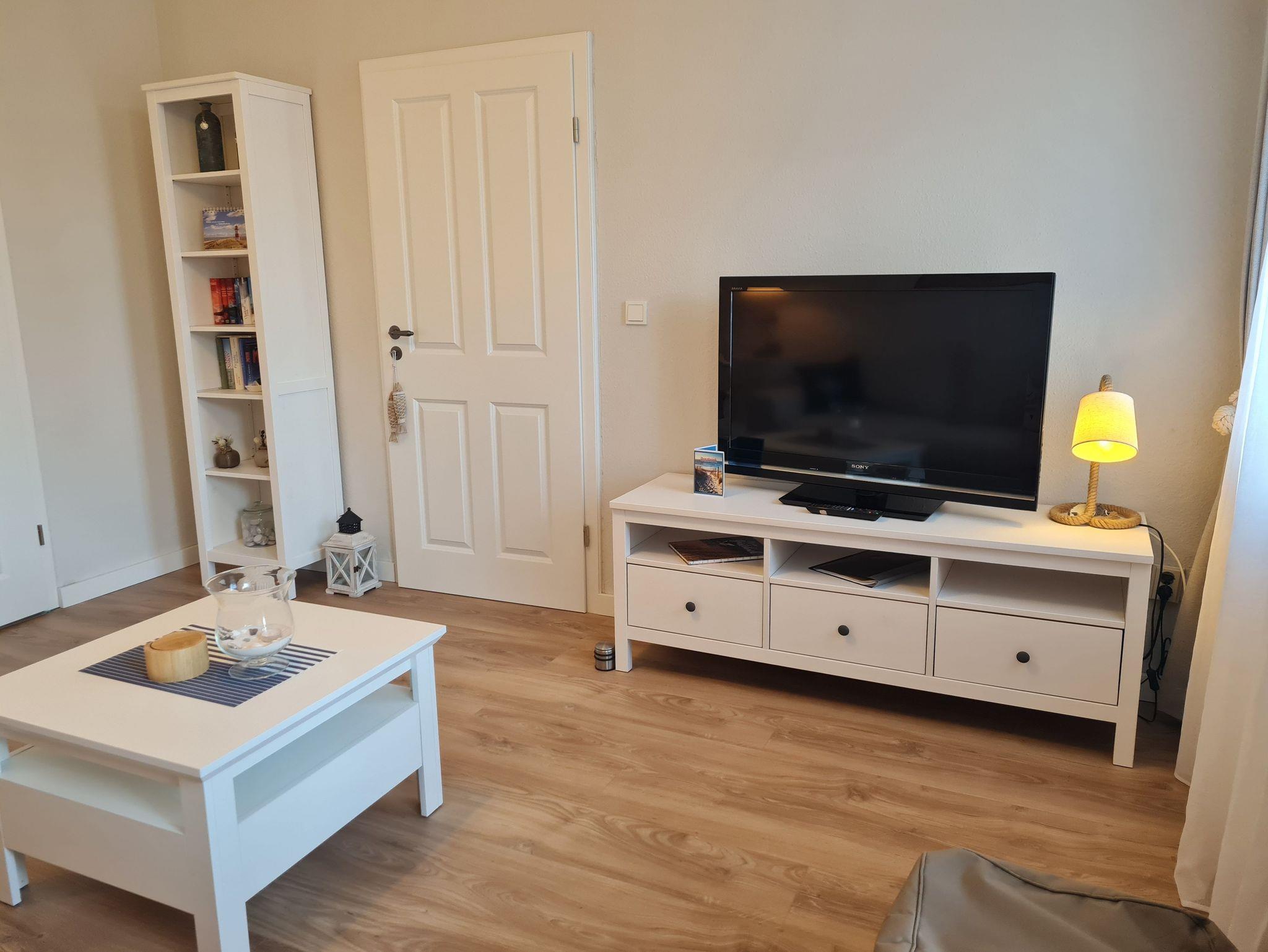 • Wohnzimmer: moderne Couch mit Schlaffunktion mit 140x200 cm, Tisch, 2 Sessel, Flachbild-TV, TV Schrank, Leselampe