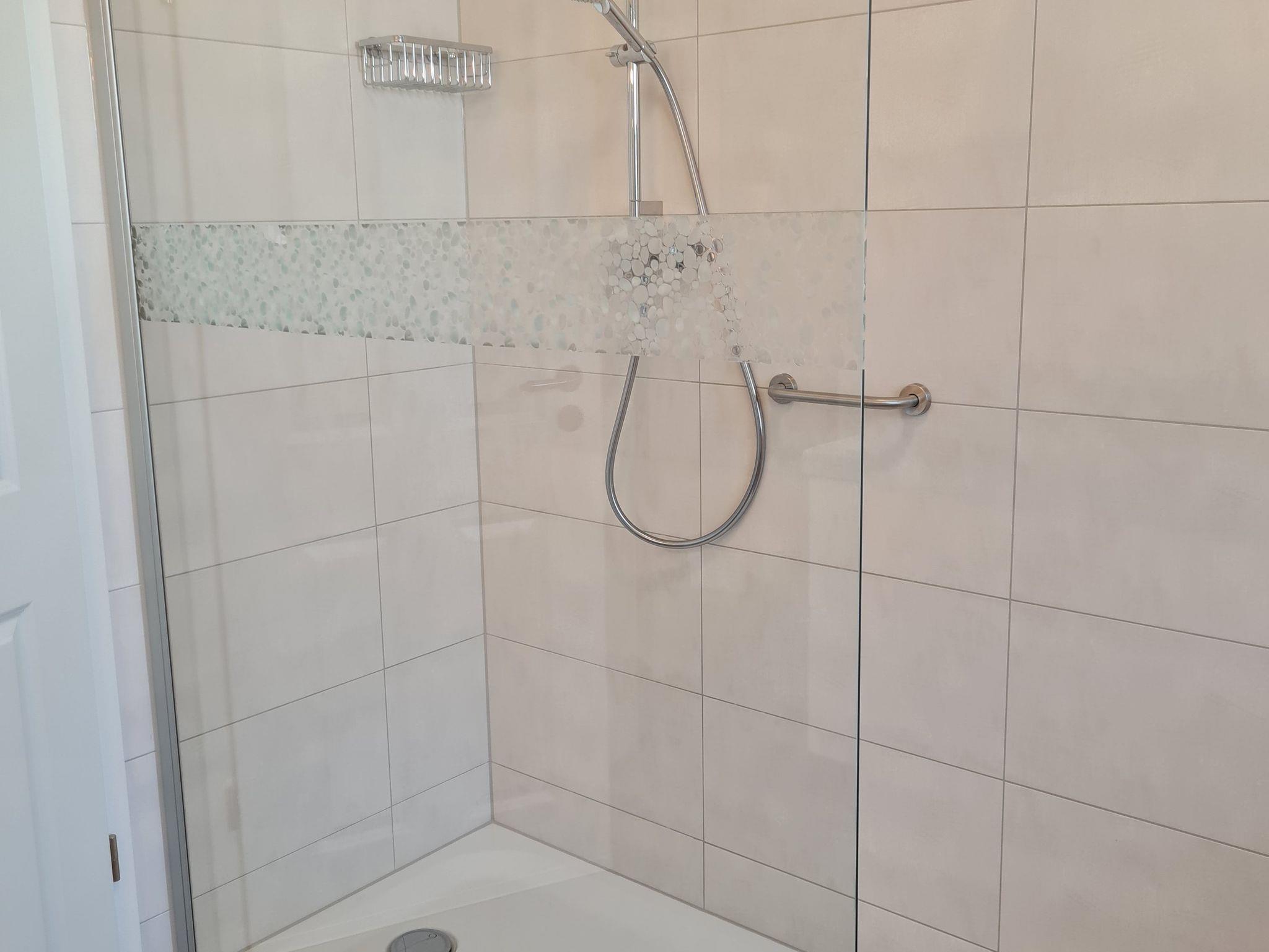 • Bad: Tageslichtbad mit geräumiger Dusche, Waschtisch mit Unterschrank, Toilette, Spiegel, Handtuchhalter, Regal