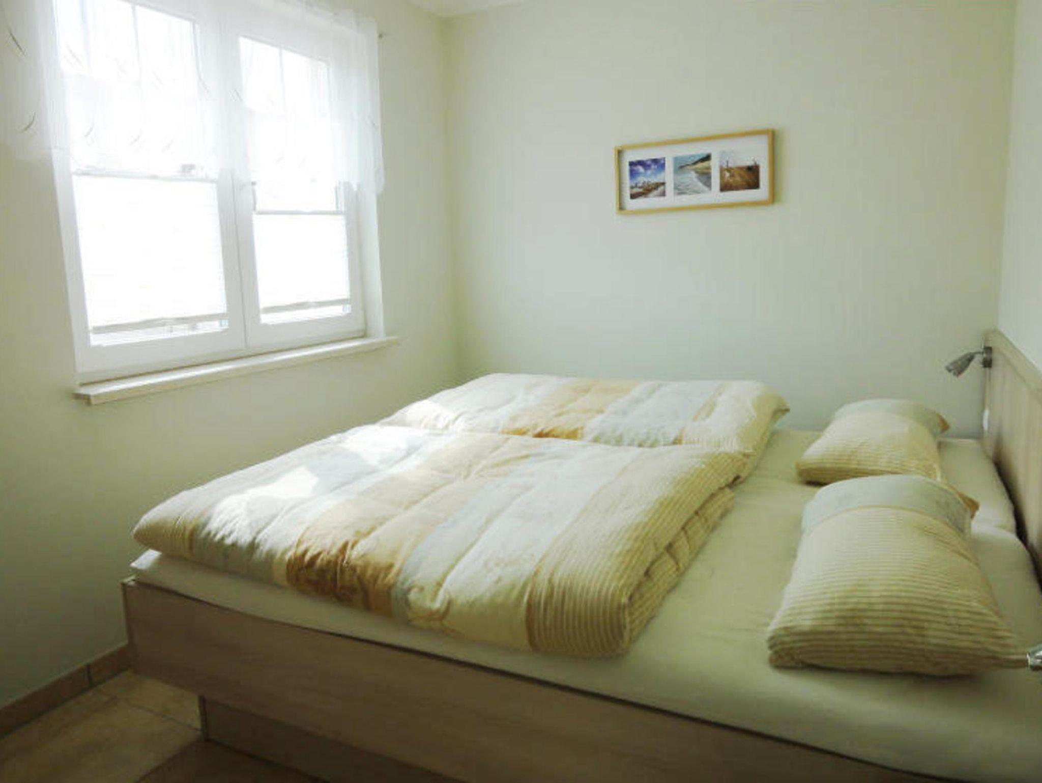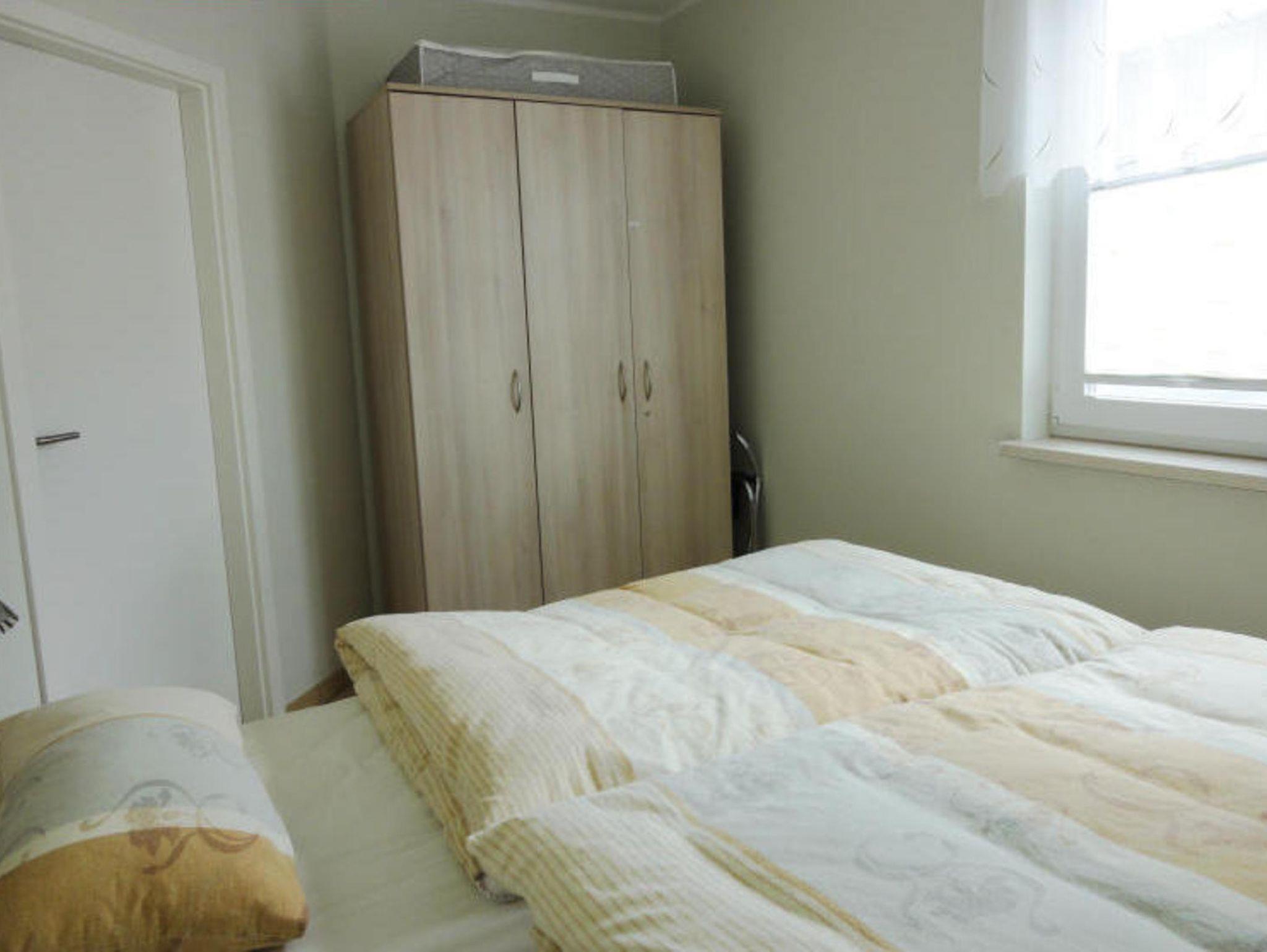 Im Schlafzimmer befinden sich ein Doppelbett und ein Kleiderschrank.