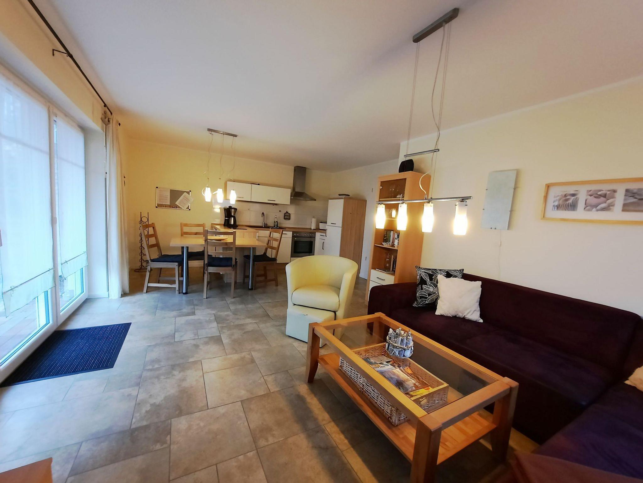 Diese schöne, geräumige 3-Zimmer-Ferienwohnung im Erdgeschoss verfügt über ein Wohnzimmer mit Eckcouch und Flachbild-Fernseher. Vom Wohnzimmer können Sie auf die sonnige Terrasse treten und dort Ihre Mahlzeiten genießen. Die offene, ins Wohnzimmer integrierte Küche ist voll ausgestattet und verfügt über einen Esstisch für 4 Personen. Das erste Schlafzimmer ist mit einem Kleiderschrank und einem Doppelbett mit 2 Matratzen (je 90x200 cm) ausgestattet, das zweite verfügt über zwei Einzelbetten (auch je 90x200 cm) und einer Kommode. Im Bad finden Sie eine ebenerdige Dusche und eine Waschmaschine. Ihre mitgebrachten Fahrräder können Sie im Fahrradschuppen abstellen. Ein PKW-Stellplatz befindet sich direkt vor dem Haus.