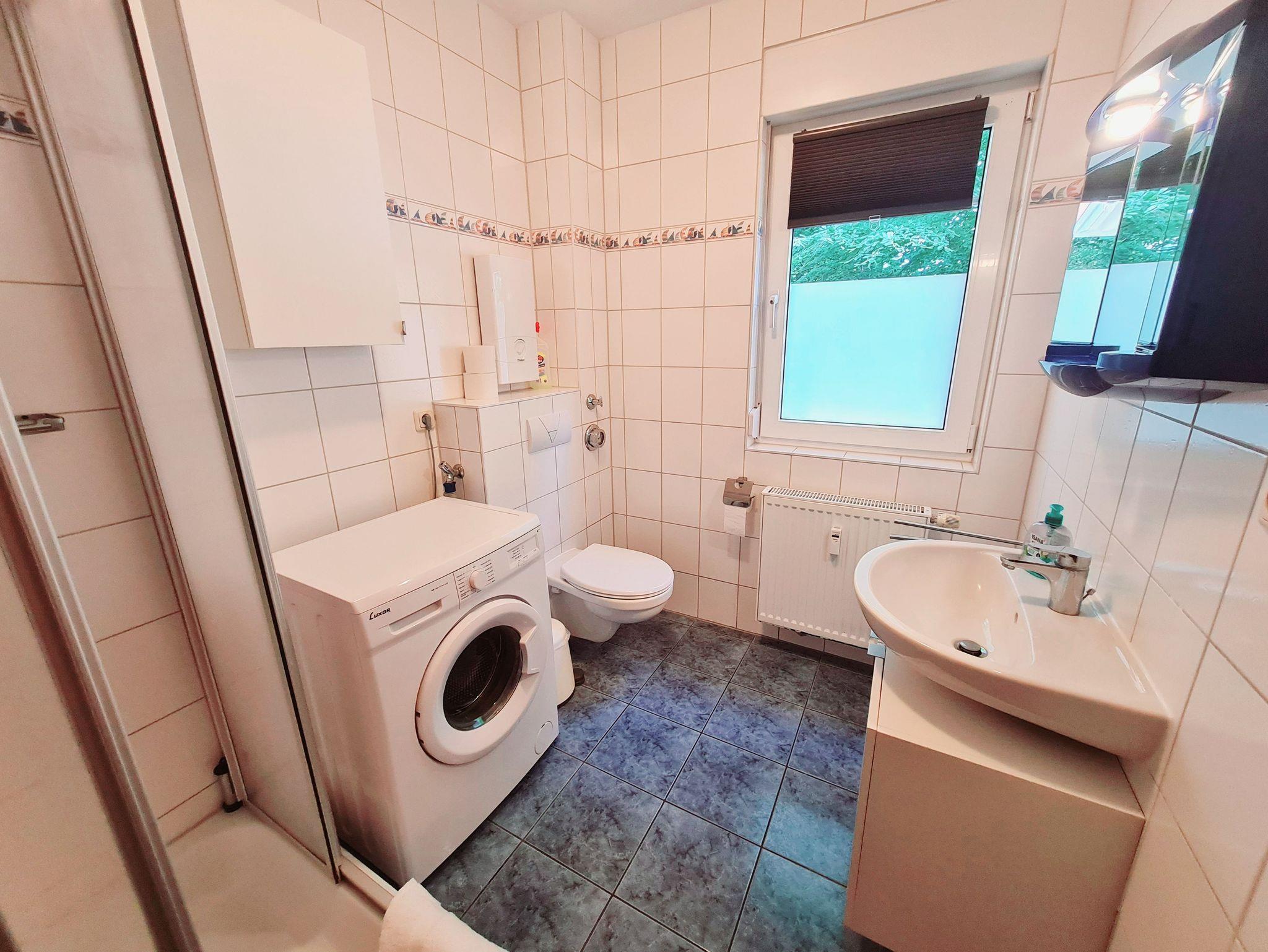 • Bad: Dusche, Waschbecken, Toilette, Spiegelschrank, Regal, Waschmaschine