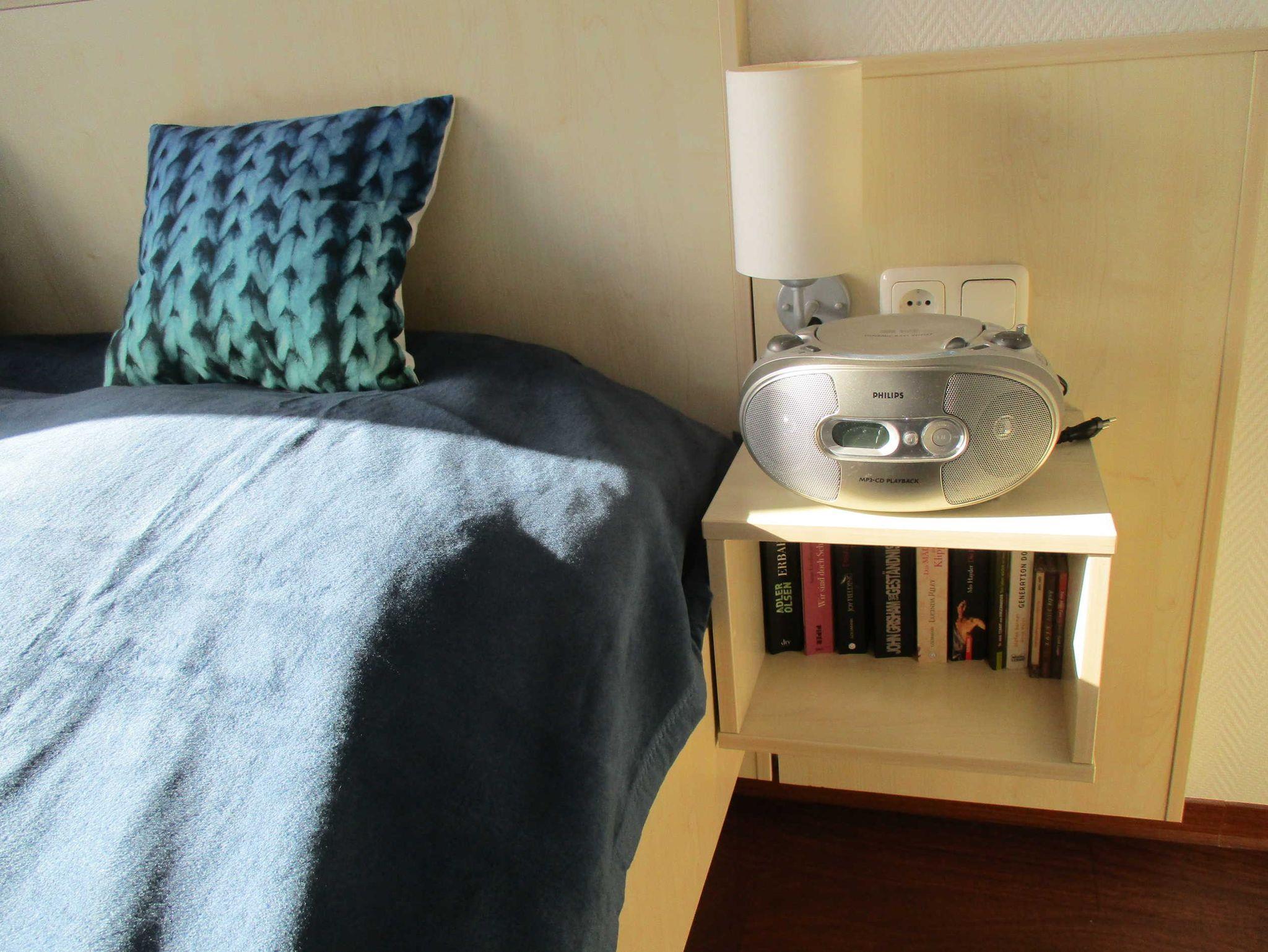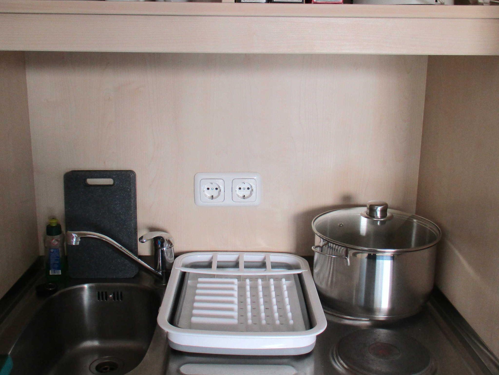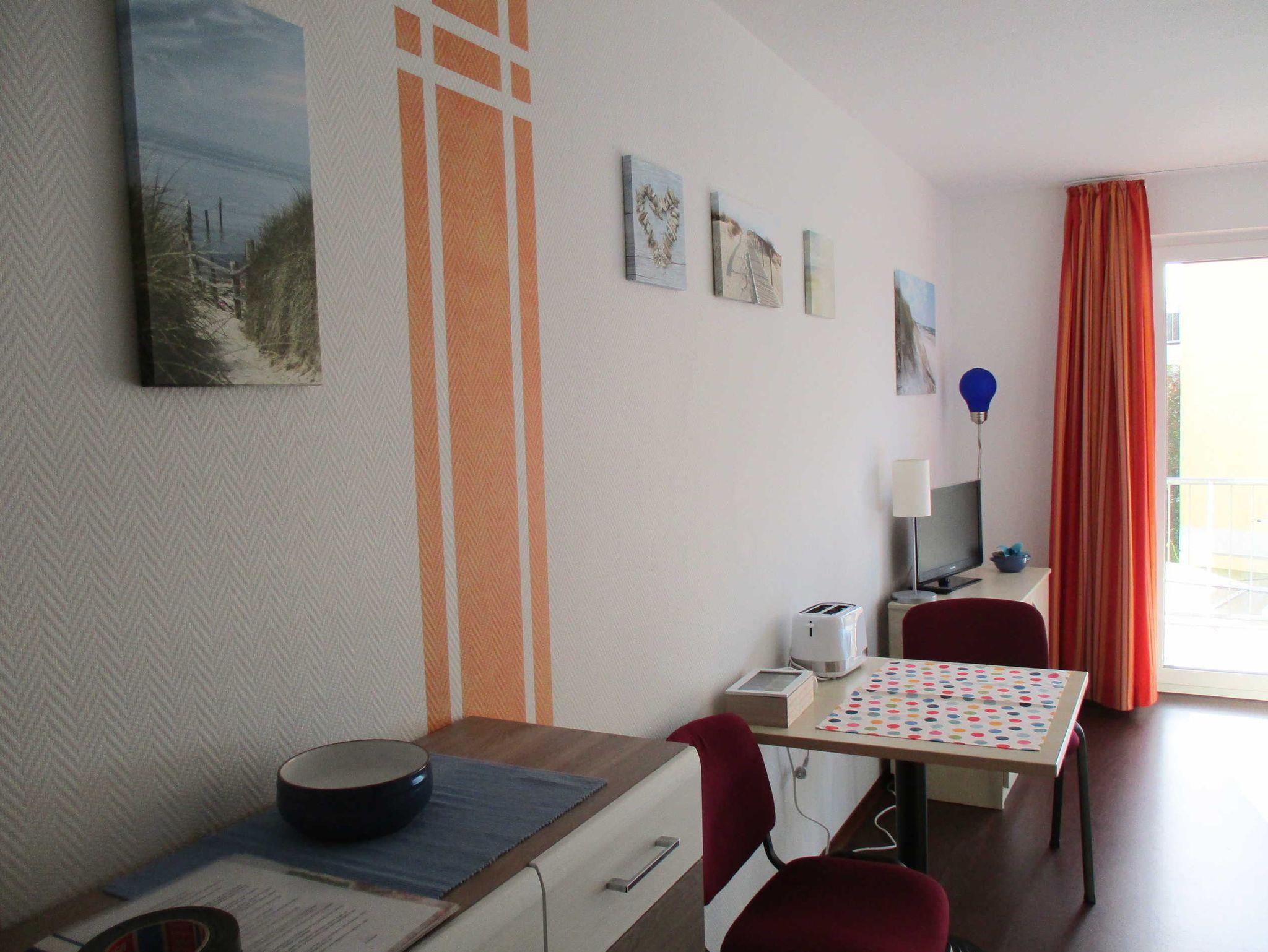 Das Apartment ist 24 qm groß und mit einem Doppelbett, Dusche/WC, Fußbodenheizung und einer kleinen Pantry-Küche (mit einem Kochfeld und einem Kühlschrank) sowie einem Balkon ausgestattet.
