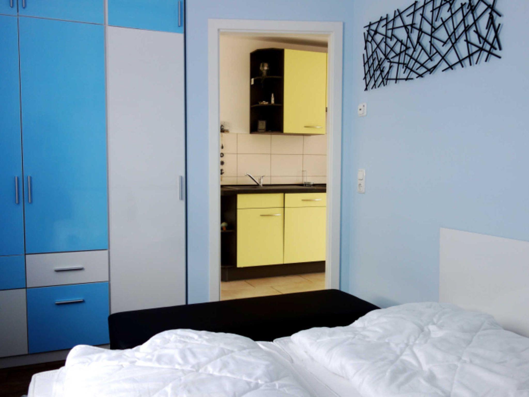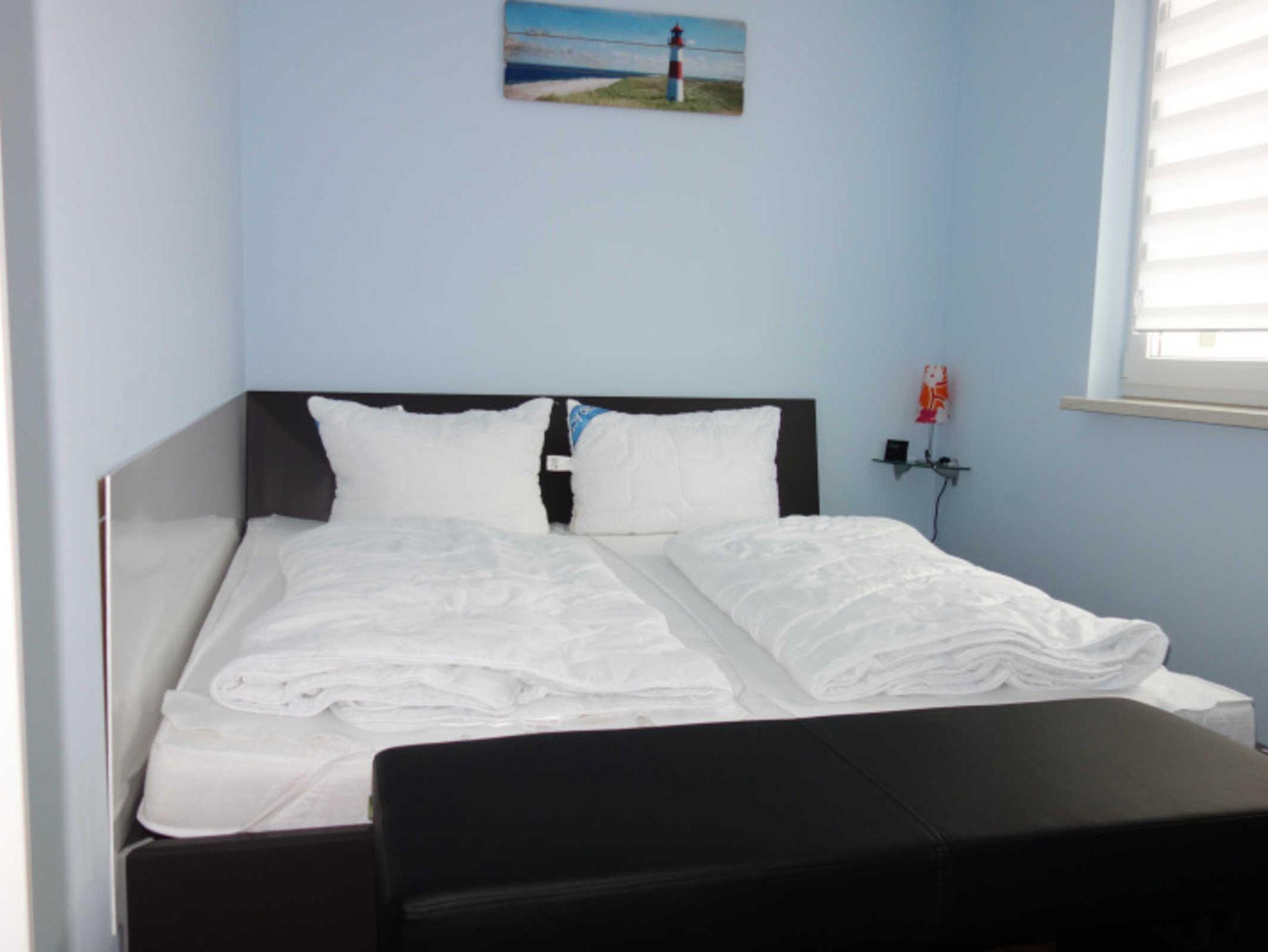 Im Schlafzimmer befinden sich ein Doppelbett (2 Matratzen mit je 90 x 200 cm) und ein Kleiderschrank.