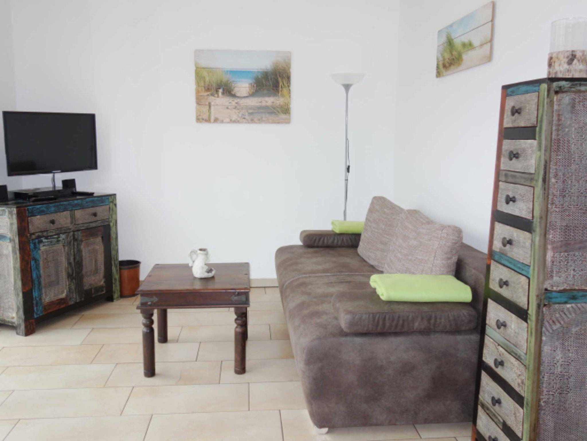 Das Wohnzimmer verfügt über eine ausziehbare Schlafcouch, einen Fernseher, einen Blu-Ray Player und ein Radio.