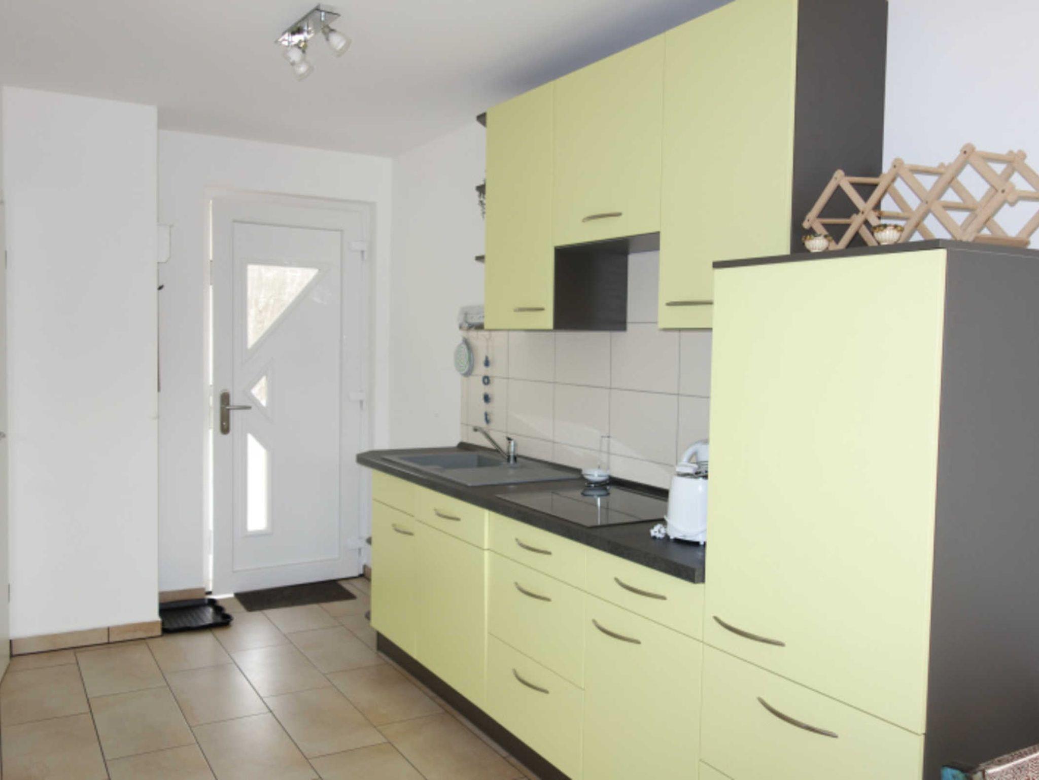 Die in das Wohnzimmer integrierte Küche ist u.a. mit einem Geschirrspüler, einem Kühlschrank mit Gefrierfach, einem Ceranfeld mit 4 Kochfeldern, einem Wasserkocher und einer Kaffeemaschine sowie einem Esstisch mit 4 Stühlen ausgestattet.