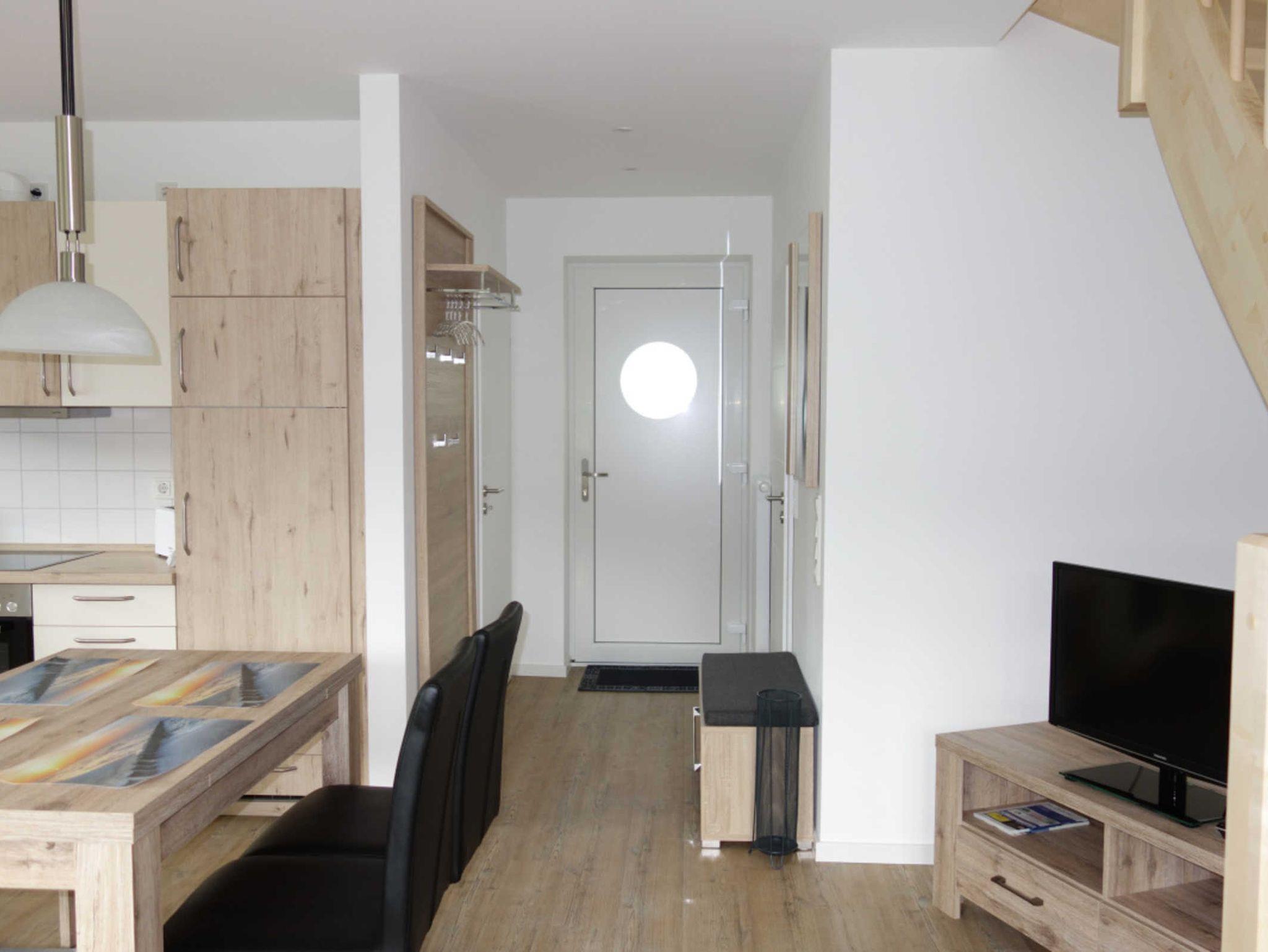 Im Erdgeschoss befinden sich der große Wohnraum mit integrierter Küche sowie ein Bad.