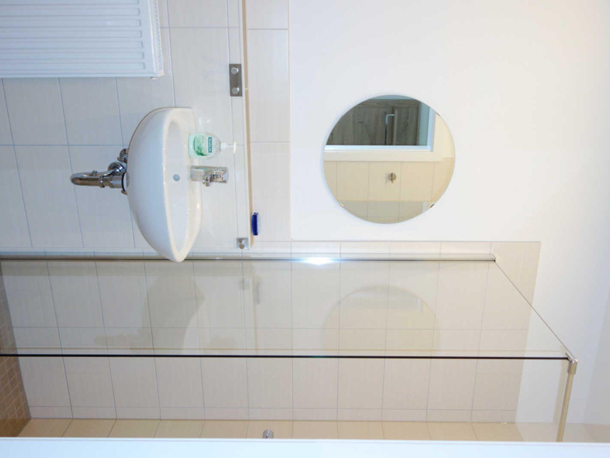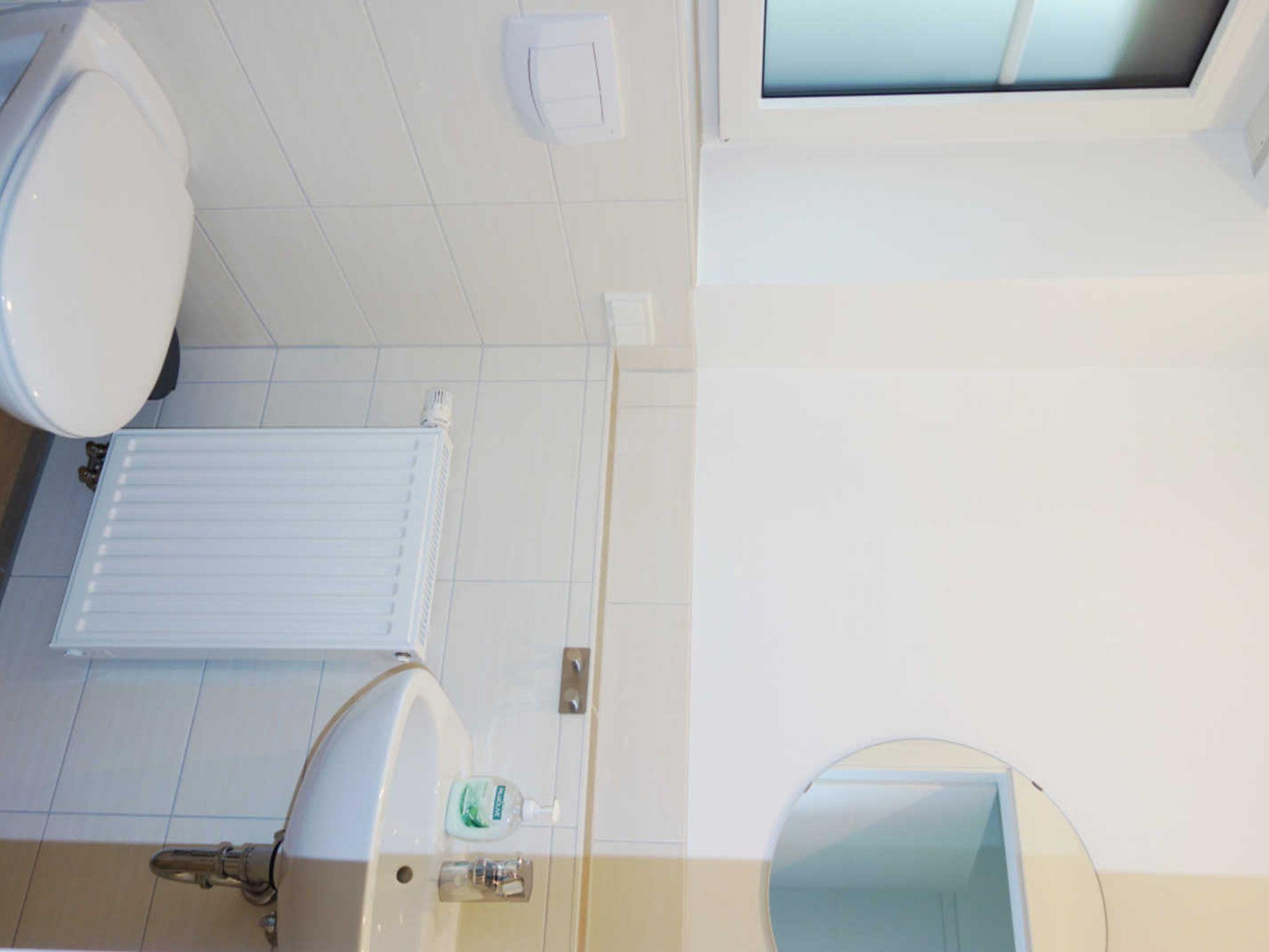 In dem Bad mit Fenster finden Sie eine Dusche, ein WC und ein Waschbecken.