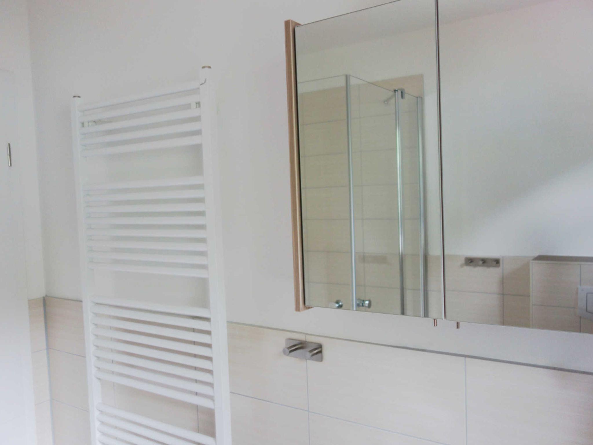 Das Bad im Obergeschoss hat ein Fenster und verfügt über ein WC, eine Dusche und ein Waschbecken.