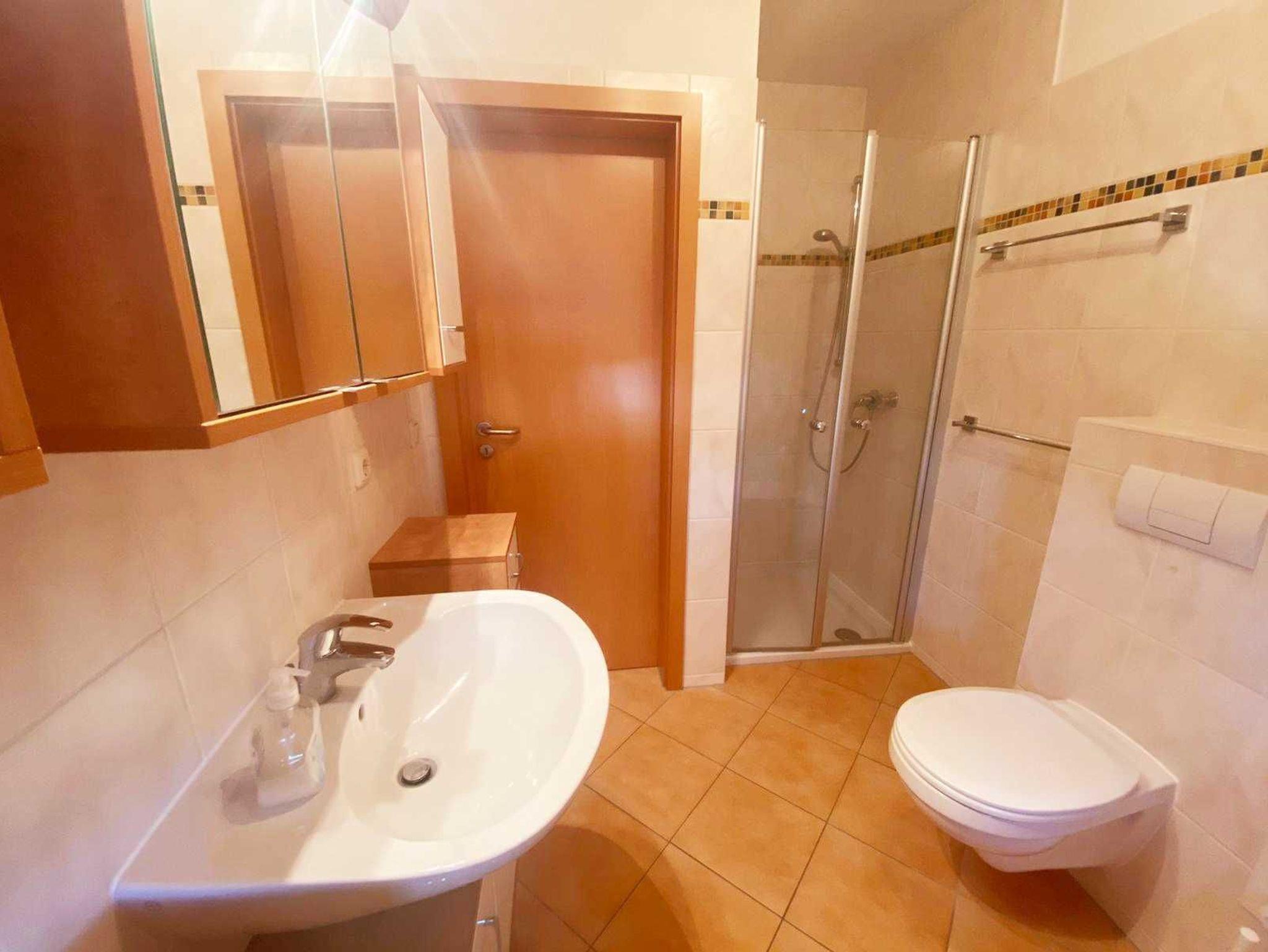 • Bad: mit Fenster, Dusche ebenerdig, Waschbecken, Toilette, Spiegelschrank mit Ablagemöglichkeiten, Schränke