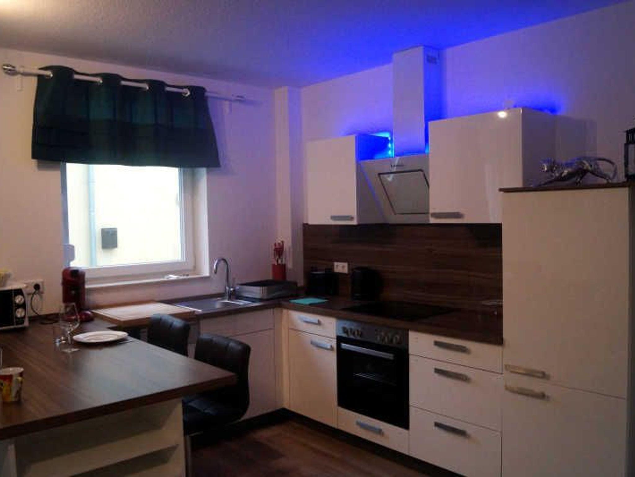 Die offene Küche ist in das Wohnzimmer integriert und ist unter anderem mit 4 Ceranfeldern, einer Backröhre, einer Geschirrspülmaschine, einem Kühlschrank, einer Mikrowelle, einem Sandwich-Toaster, einem Wasserkocher und einem Toaster sowie einer Senseo Kaffeemaschine ausgestattet.