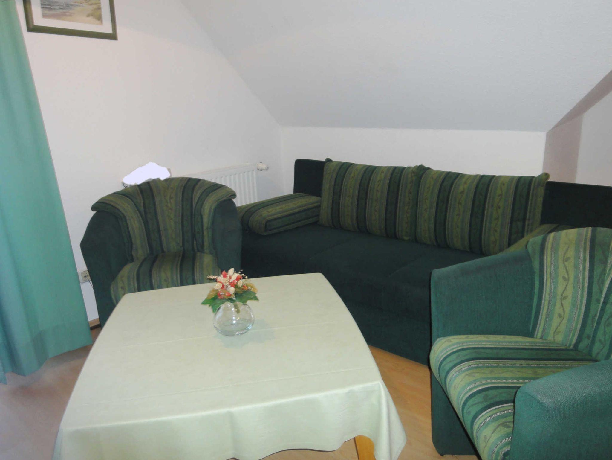 Der Wohn- und Schlafbereich ist mit einer Schlafcouch für 2 Personen ausgestattet und verfügt über eine kleine Stereo Anlage mit CD-Player sowie einen Flachbildfernseher. Zu dem Appartement gehört ein Balkon mit Richtung gen Süden.