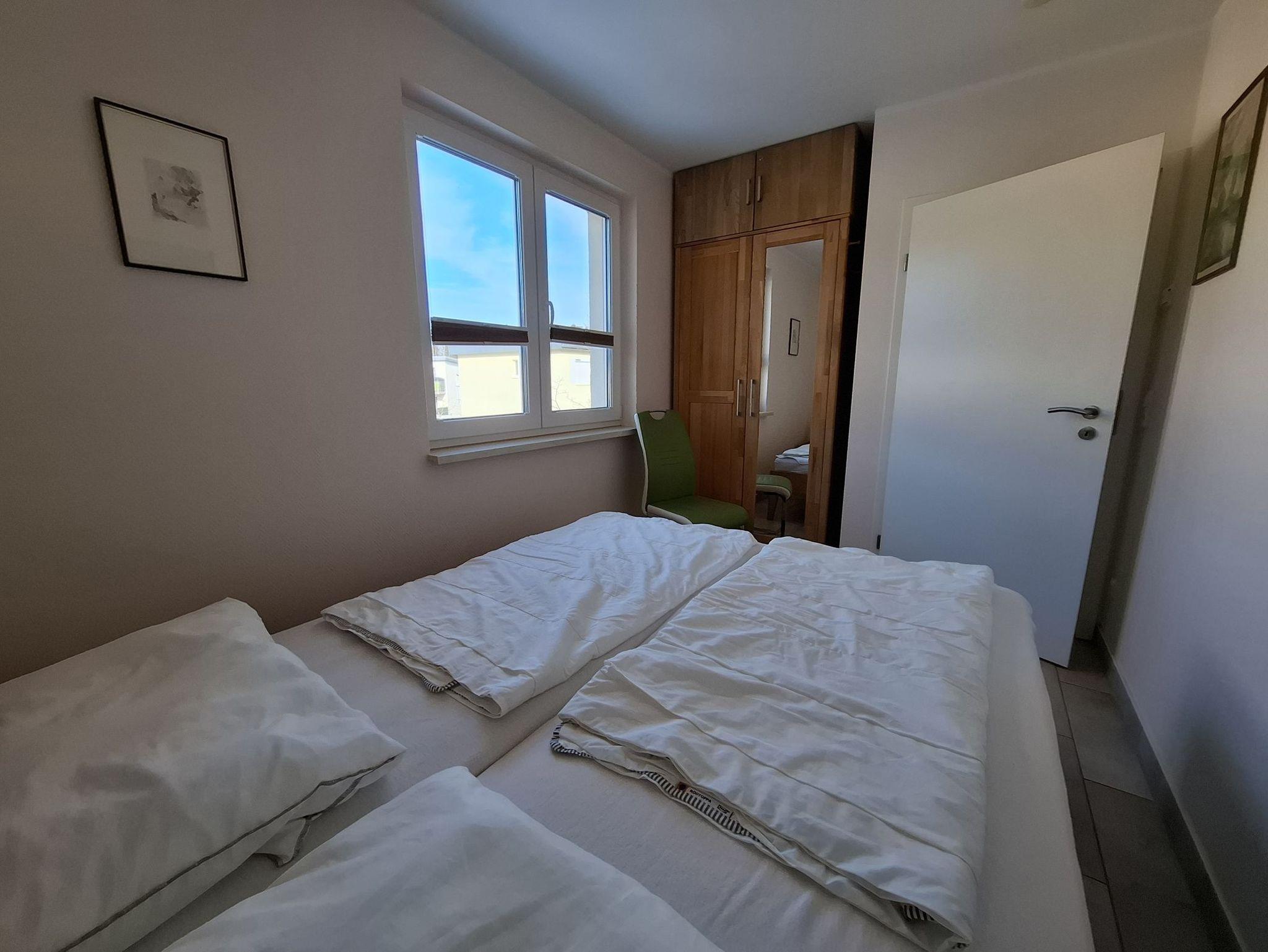 Das Schlafzimmer verfügt über ein Doppelbett soiwe einen Kleiderschrank.