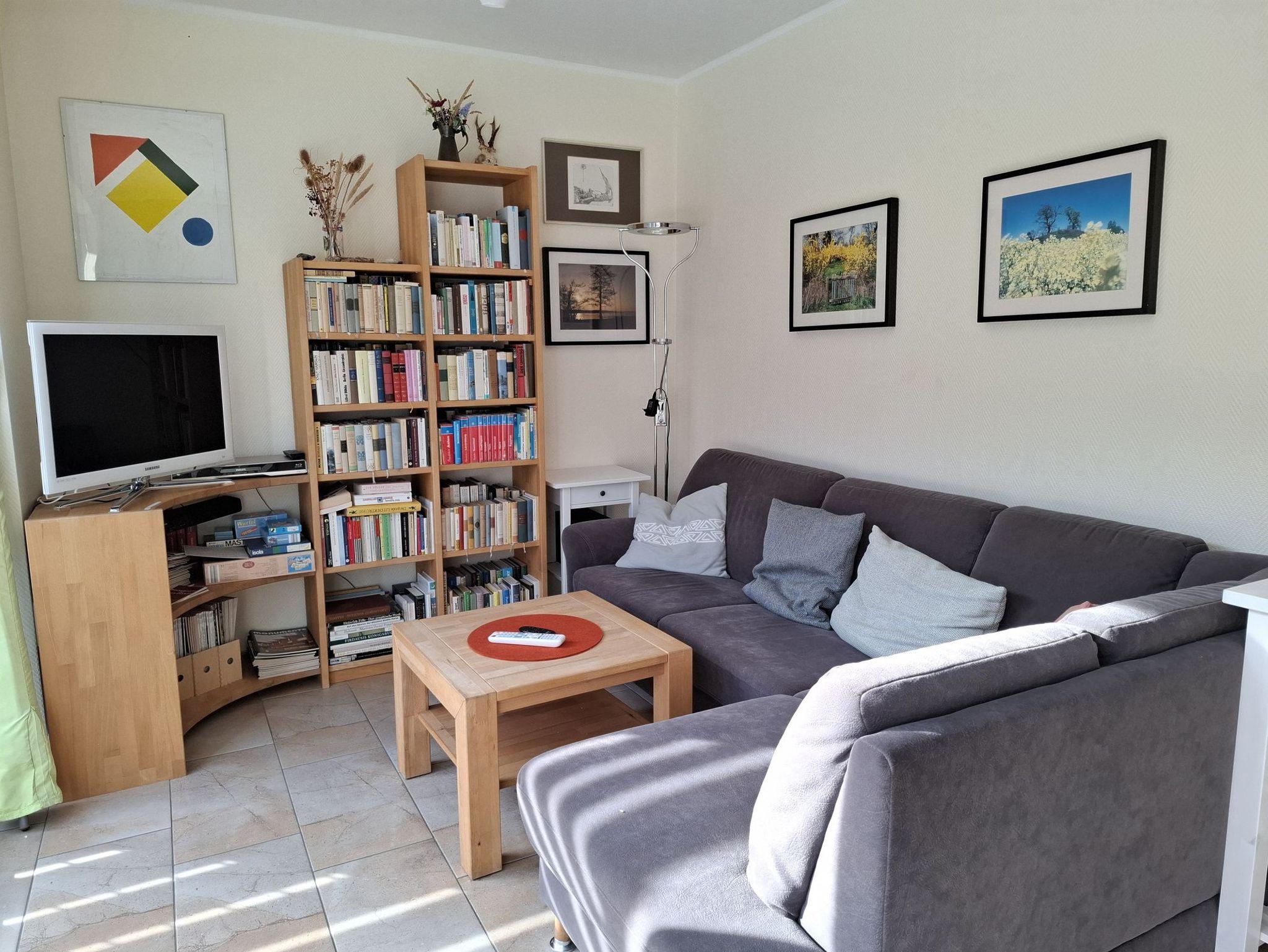 Das helle Wohnzimmer verfügt über eine Couch, einen gemütlichen Essbereich sowie über einen Fernseher und ein Radio.