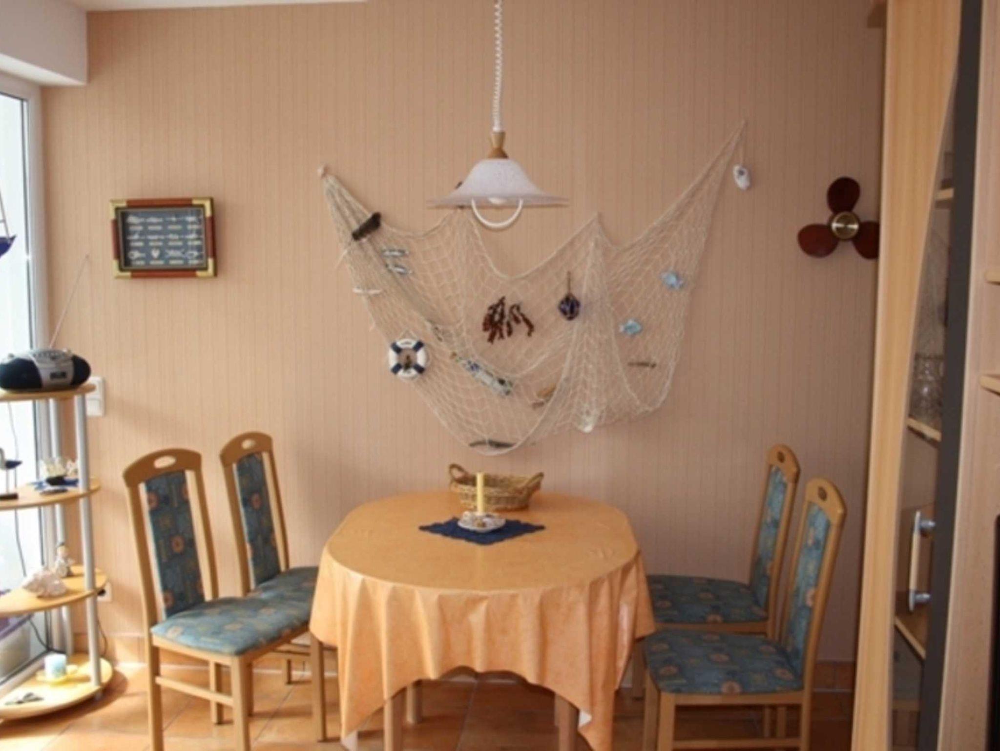 gemütlicher Wohnraum in maritimen Flair mit Balkon, offene Küche und separatem Schlafzimmer.